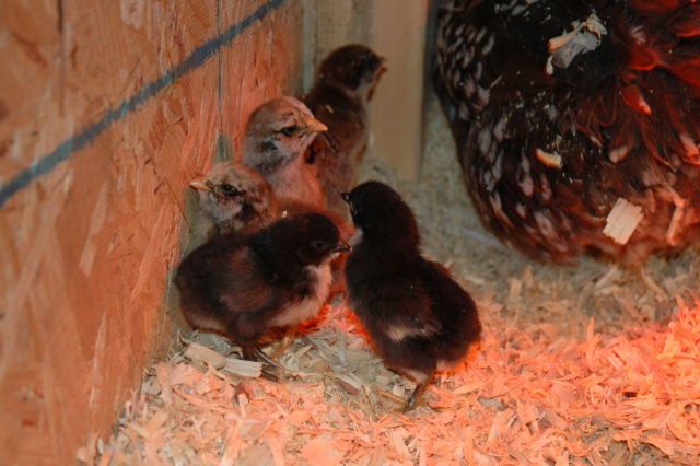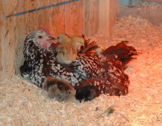 I bought two light colored bantam chicks to place under her too, hoping that they'll help teach the little one what to do. It worked a little, their pecking at the ground encouraged her to do the same.
