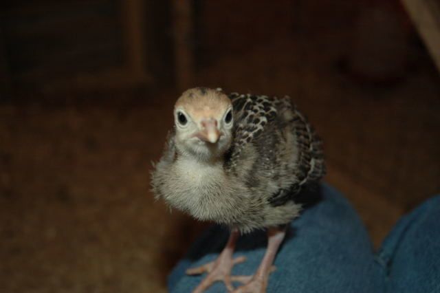 This is our Narragansett poult, hatched 4/7/12. Her name is Tickles and she runs, now flies to us when we come into the brooder coop. During the day she runs up one arm, across our shoulders, and down the other. She loves to sit on DH head. She thinks we are her people.