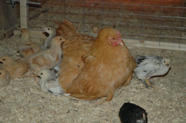 Mama BO with some of her 15 chicks and one turkey poult. Some are Buff Brahma x Lt. Brahma, some Buff Brahma x Buff Orpington, two are JG, and the turkey poult is Narr x Royal Palm.