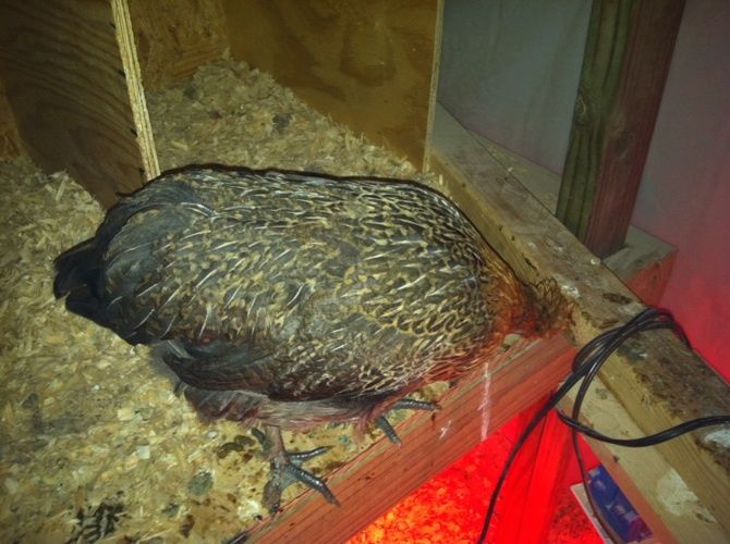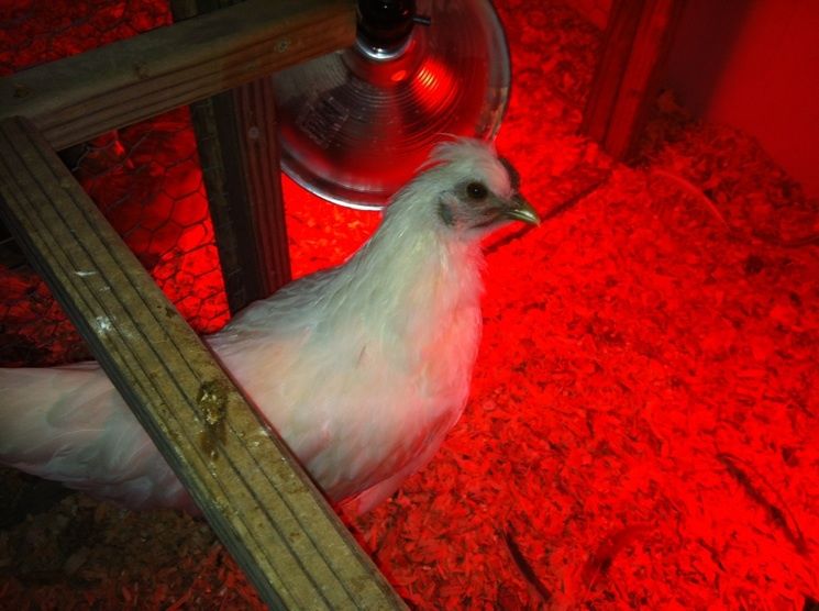Close up of Moody face, she has green legs. Moody is solid white even thought you can't tell because of the red light. She is gorgeous. We were told she was a hen but are suspecting she may be a rooster. She is about 10 weeks old.