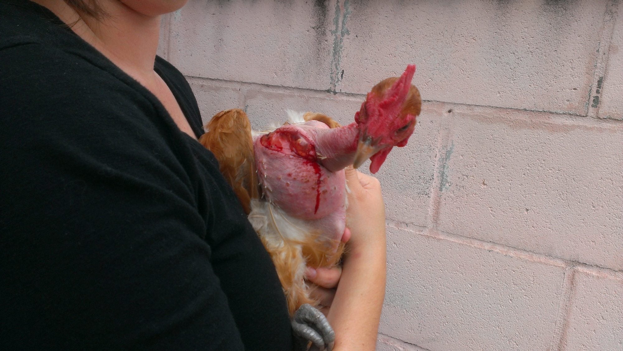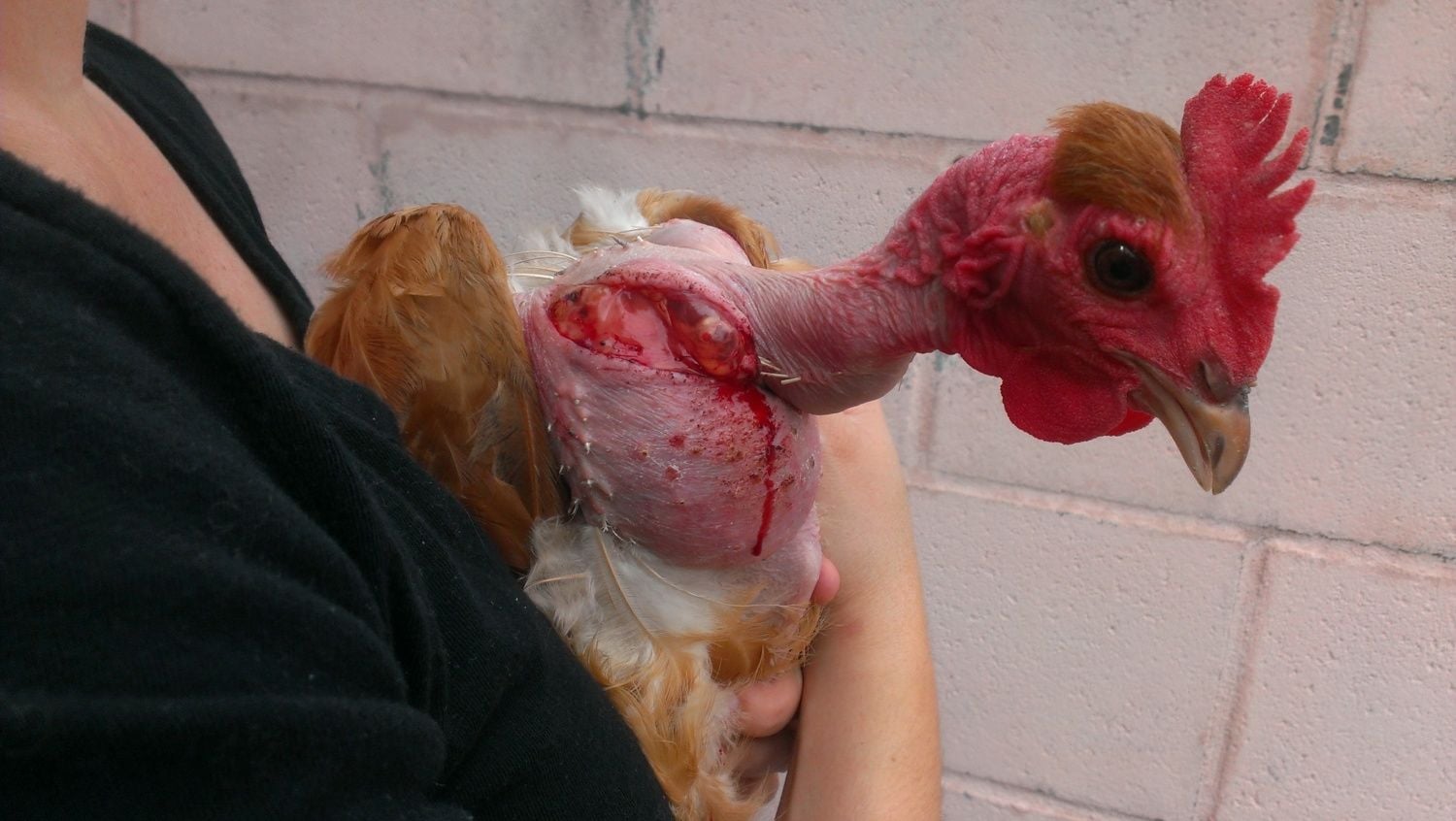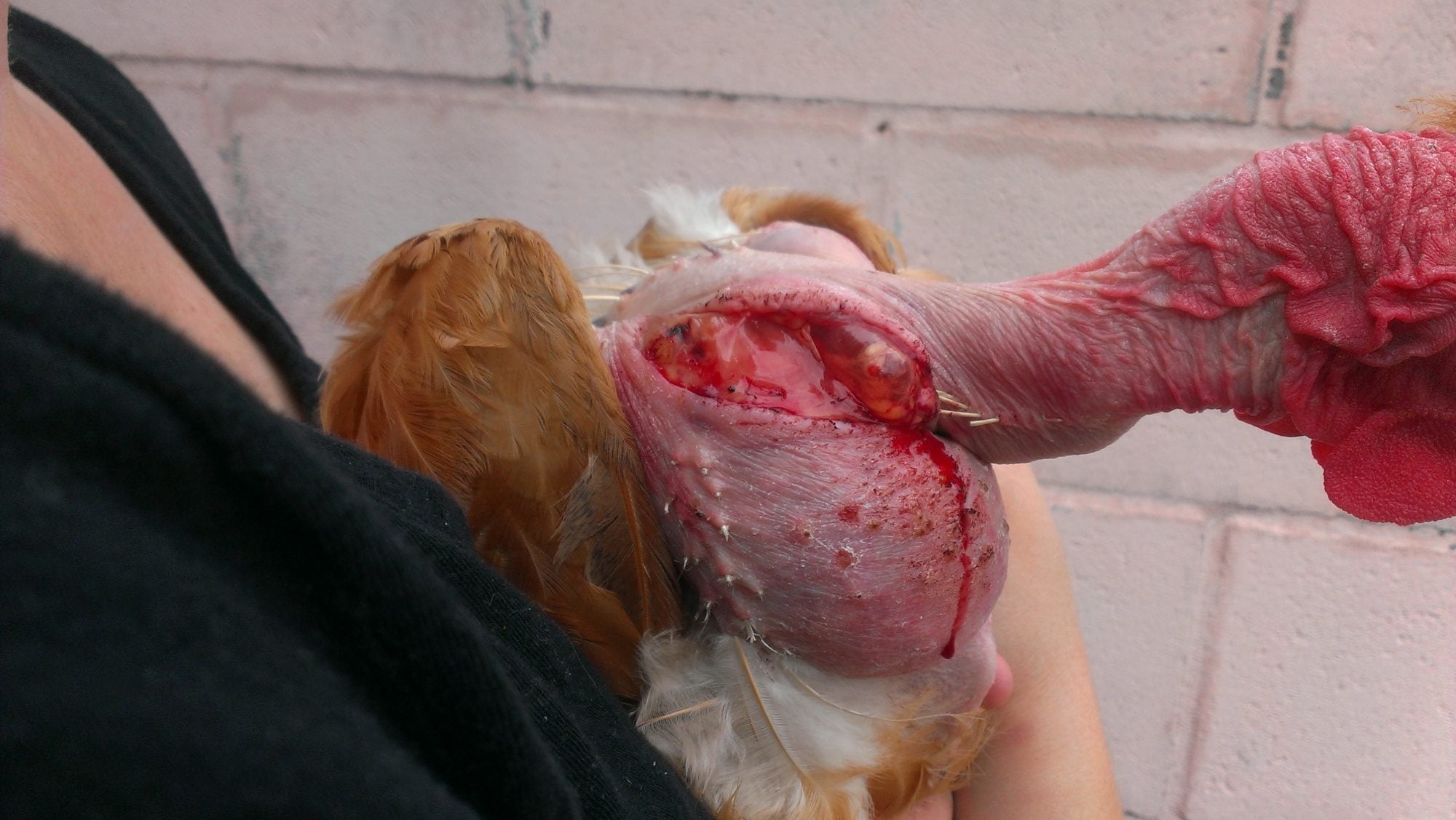 Something attacked our hens last night. One is missing with tons of feathers left behind and this one, Ella, has a pretty bad cut on her neck. The cut is long, but doesn't seem to be terribly deep. One thing that is very worrying is the clear sack (what is that?) that is sticking out at the top of the cut. She is a naked neck, almost 2 years old. She still ate a lot when fed today- hence the giant crop, and she seems to be acting fairly normal, but how do I know whether she is in terrible pain? Also, with this much skin torn off/ cut open, is it a wound that has a chance of healing? I really need some advice. I would be glad to treat the wound if that's the best thing to do, but if she's in agony and/or not going to heal I would rather put her down humanely than let her suffer. What do you think?