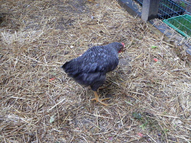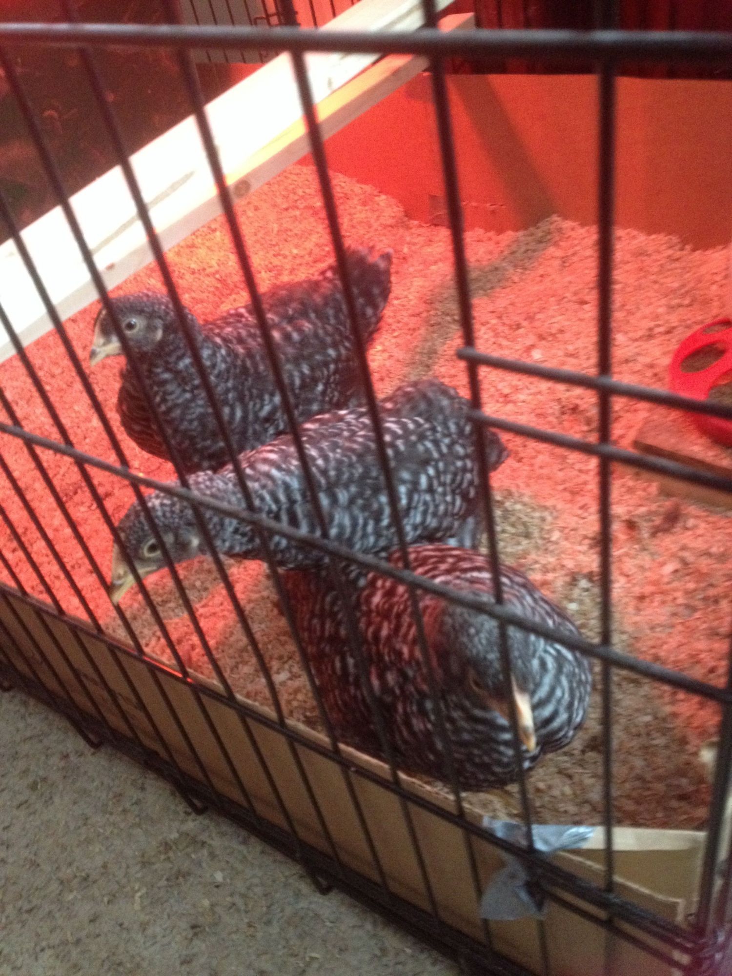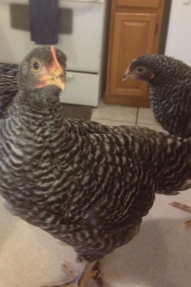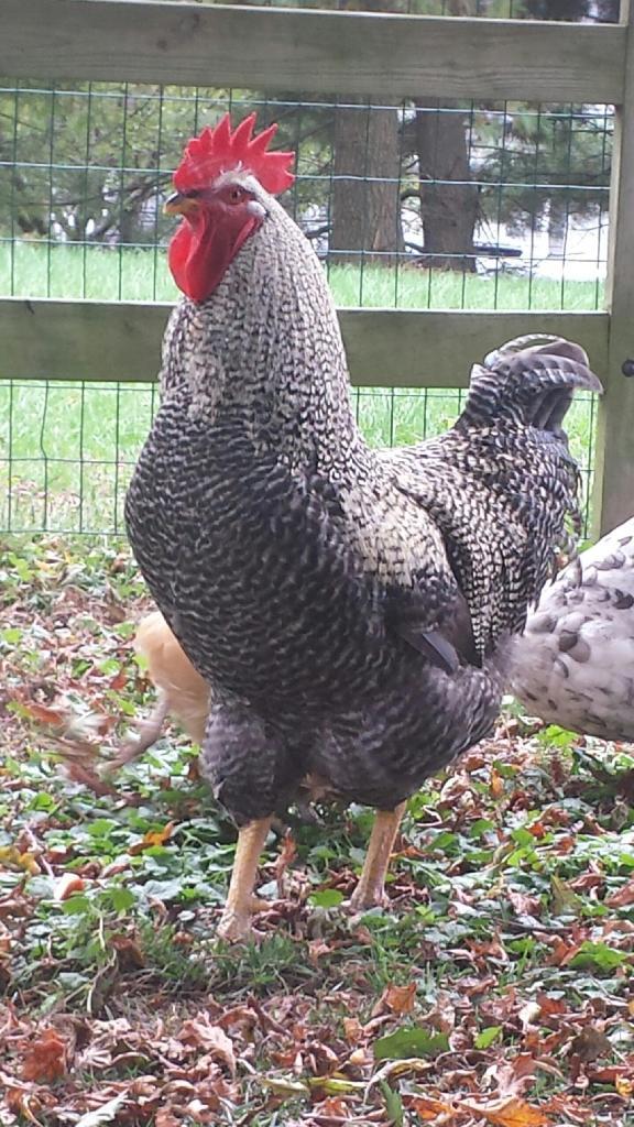 He's beautiful. Hope my two boys grow up to be that pretty.I will show you some pics my Bar Rock Rooster from 3 days old (3/17/13) to maturity, I bought him with 3 others and he was distinctive in markings and behavior. He definitely ruled all the others. I just love him! I am lucky he is so sweet! It's good to have a rooster, at first I was upset with having one as I thought I would have all girls that are so sweet. He is a big boy! He watches for predators and when in danger calls all the girls and they run to the coop and run that is attached. He calls to the girls that he found something good to eat and share all of the time. I have even seen him feed his girls. I think the most important thing with the cockerels is that you have a lot of contact with him. Talk to him and hold him (then you are taming him) the most important thing is do not be afraid of him. If he is bad (aggressive) with you or the hens keep a hose or water spray bottle near and squirt him and tell him BAD BOY! They learn very quickly they are intelligent! SO hear is my "Bell" that tuned into "Bill" Hope this helps! Kodi 7 DAYS OLD YOU CAN SEE HIS SPOT FADING HIS BEAK IS BLACK & YELLOW ~ MARCH 2013JUVENILE STAGE 8 WEEKS OLD ~ MAY 2013