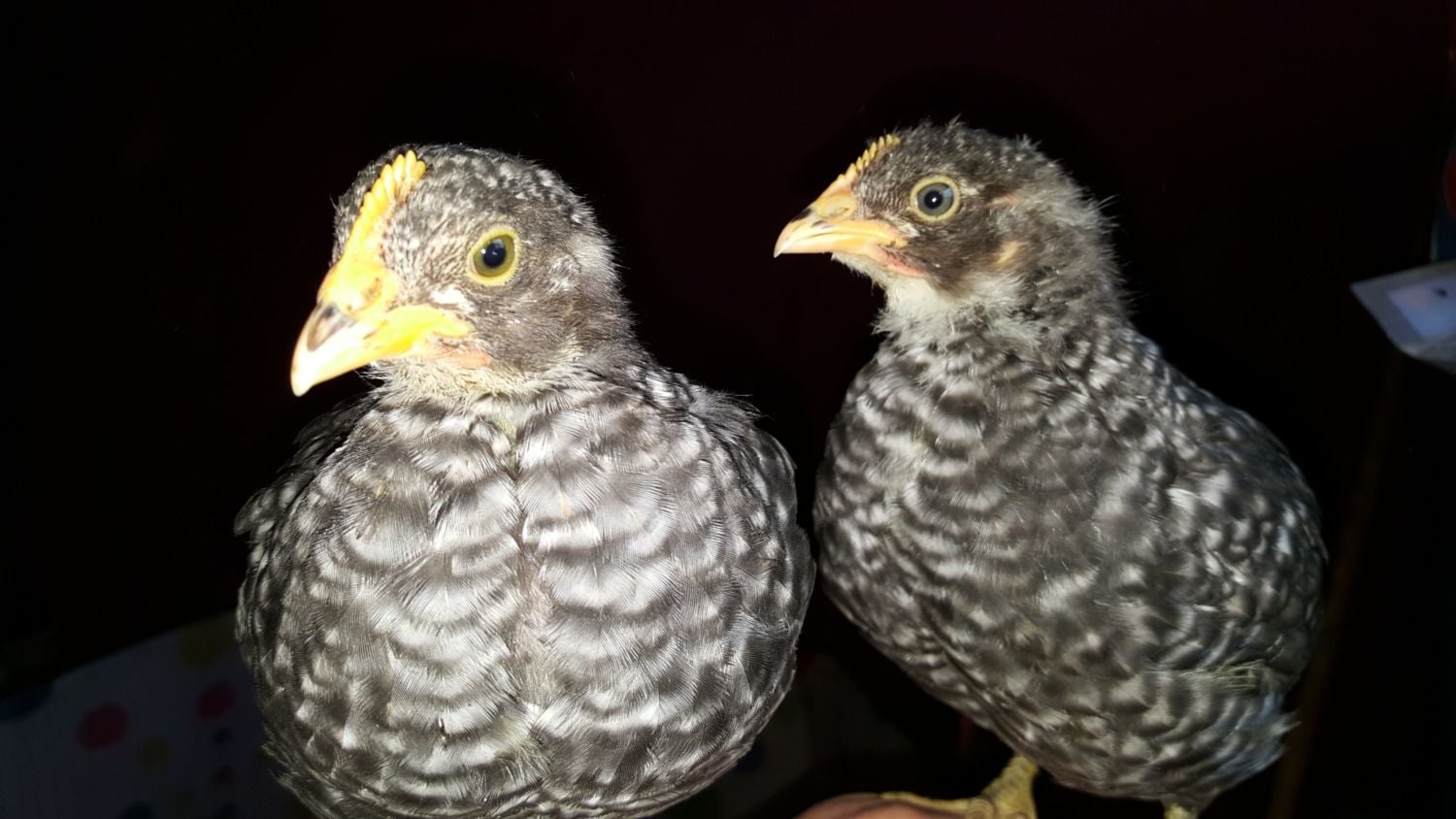 barred rock #2. Both 10 days old. Did not want their picture taken. #1 is getting tail feathers. #2 still has a fuzzy butt.![]()