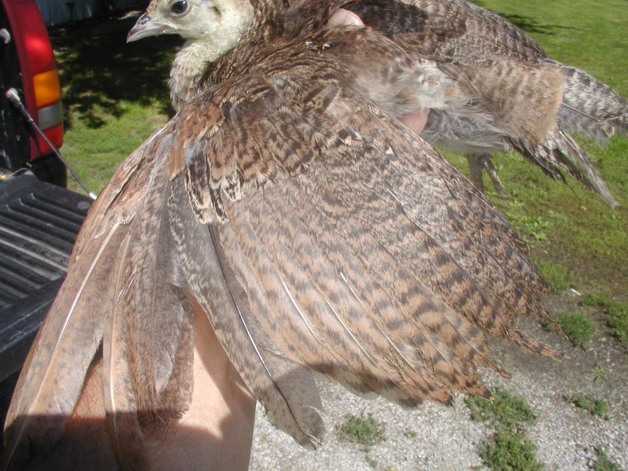 Little Roughian,Open their wings and pay close attention to the barring on the feathers.Pay no attention to the flight feathers,only the coverts-shoulder feathers. Look at post#48 and then at the top pic in post #49. Notice in pic #48 the long feather in the middle has now lost all barring on the top half of the feather and the bottom half (left of the cuticle-midrib) does not have the distinct barring anymore and is changing too.The top half of this feather is now changing to very dark brown while the bottom half is slowing changing to the same color.You can see the pigment blocks on the lower half of her wing feather that are gaining size and are the exact same color as the upper half already is. There was a long,,long discussion about feathers not changing color earlier here,and this is yet another fine example proving my point,that feathers DO NOT COME in all one color,but slowly change color overtime.,That wing feather clearly again shows color progression and at present is 2-3 diffrent colors-shades of brown. Top pic in Post #49 still shows a barring pattern thru each feather almost appearing as a continous line from feather to feather.I hope this helps,,and as I mentioned before in other posts some people do not have numerous same color-patterns of chicks that hatches together to notice these subtle changes.I look at pigment at the root of the cuticle feathers now more on some colors to gain an early sex id,,make notes,then keep track.I hope these pics helps.These chicks hatched in mid July,,so close to 7 weeks old now and I could tell a diffrence over a week ago between them.I don't really pay too much attention to IB chicks,,4 of my colors are B/S and they are the tougest to sex because they are all born yellow so thats where I have been concentrating early sexing skills-notes-techniques the most this year.