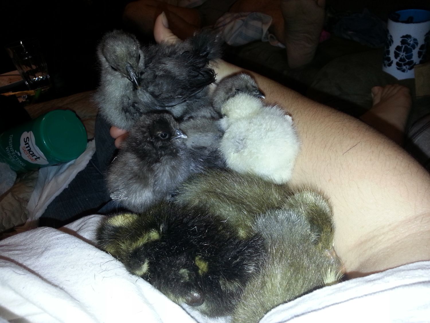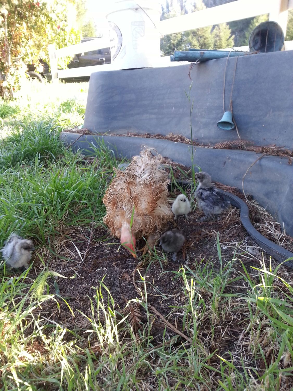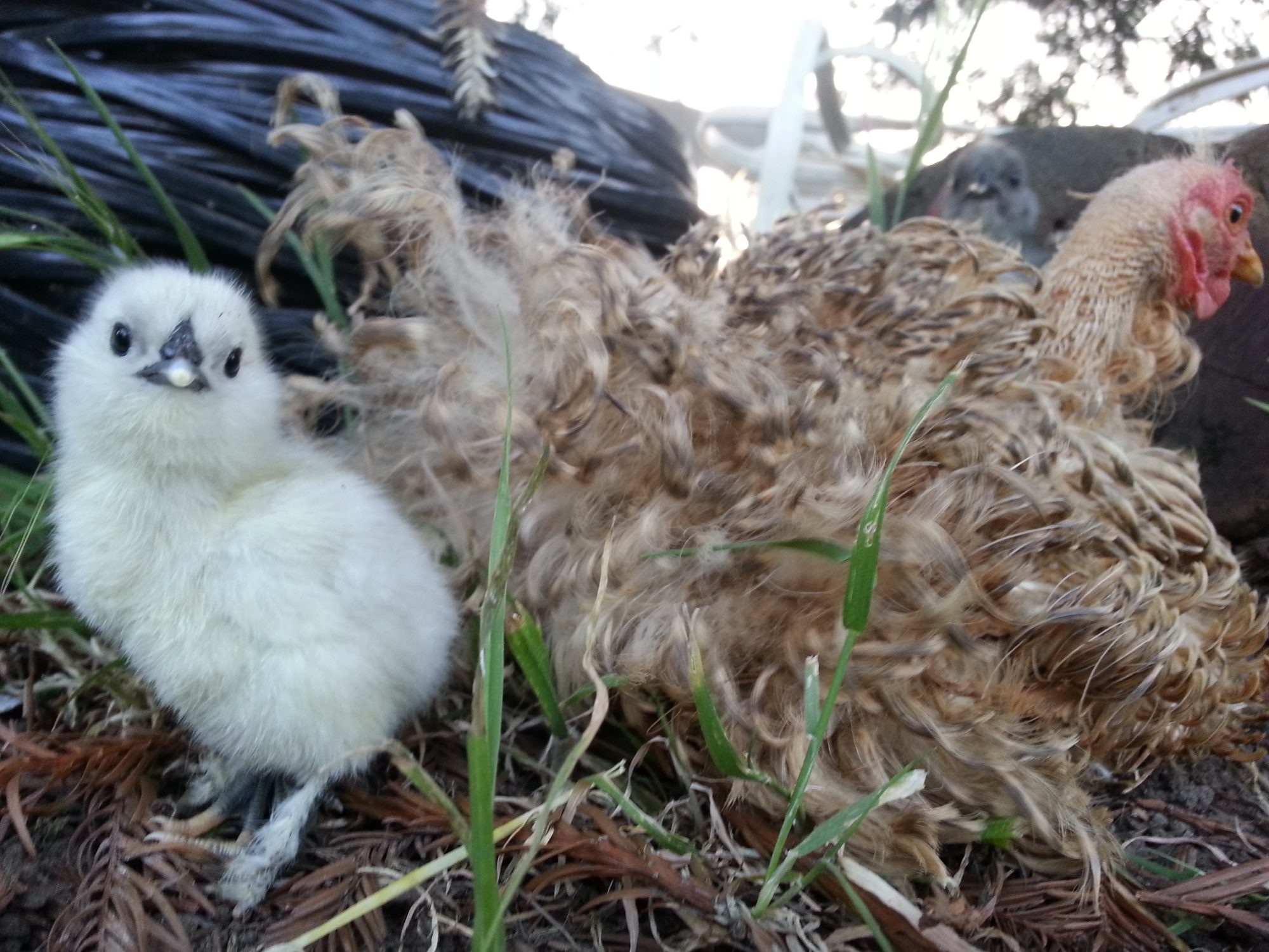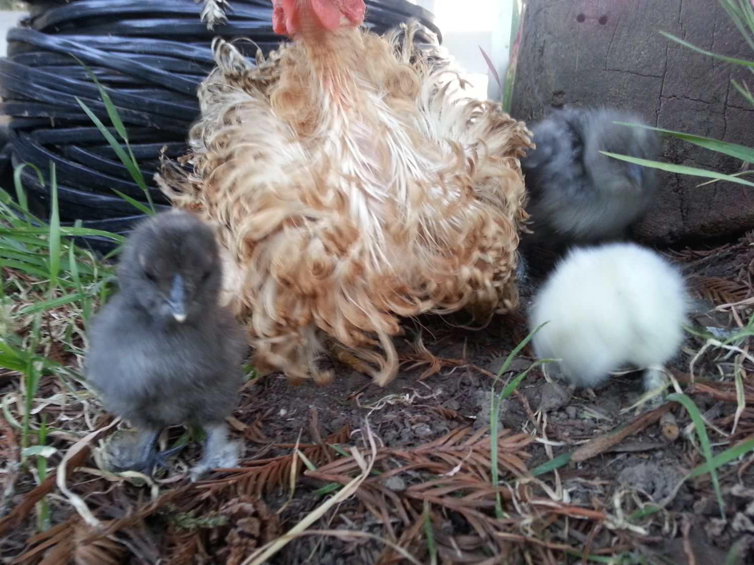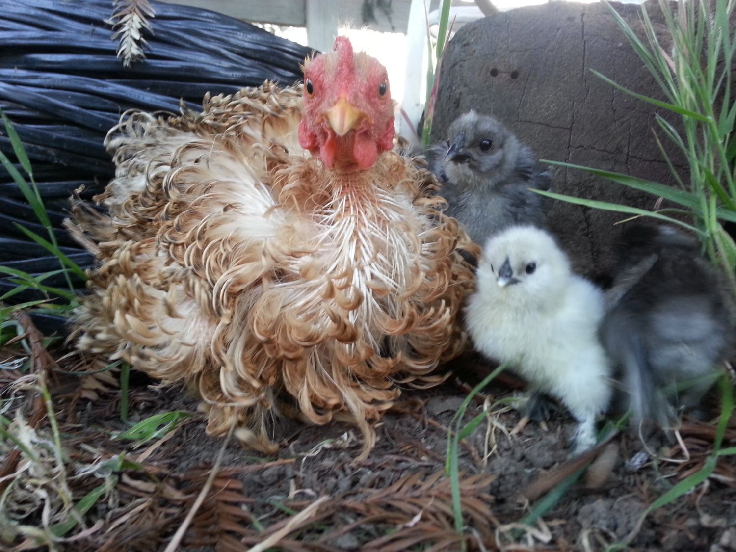 I will post some pics of the chicks soon, out of the four eggs, three hatched but one got trampled....so the other two are inside. They are teeny tiny! I get our frizzle show them how to scratch, and she was fine with the two little ones but I think one of the two chicks I took is a roo. He seems to challenge everything.