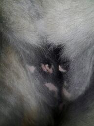 angels bag this morning. i got a drop of semi sticky milk! not sure if she will get a huge bag or not, as her mom usually doesnt. whoohaa is long, and deep red on the inside. yesterday morning her whoo haa was just 2 inches long or so and today it looks like its nearly 6 inches long! lol