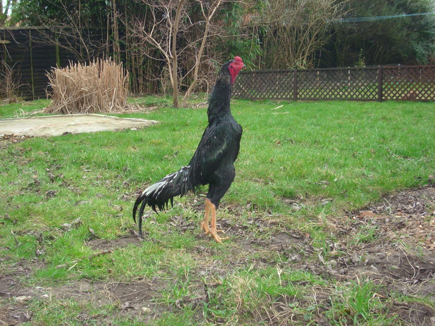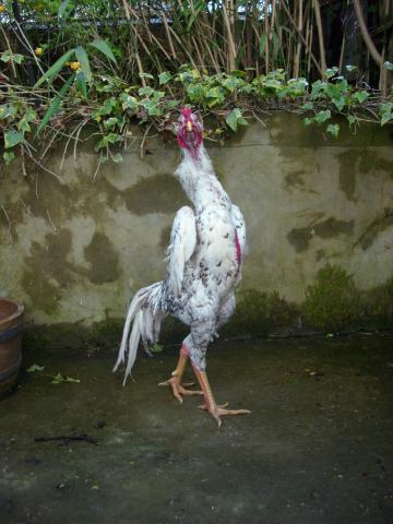 Cuckoo splash Jap shamo stag @ 14 months old and 12lb 'fit' and just over 35 and a half inches tall from my large line.