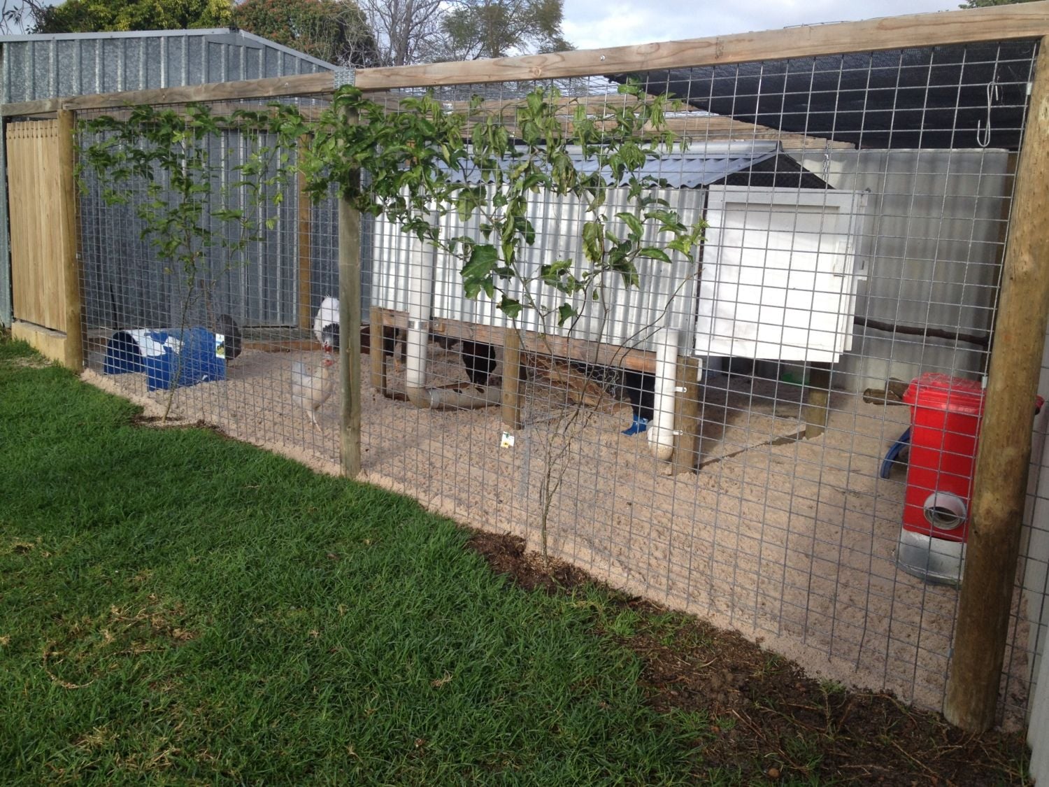 The run after we added the river sand (wet clay was terrible!) The two vines are different kinds of passion fruit.