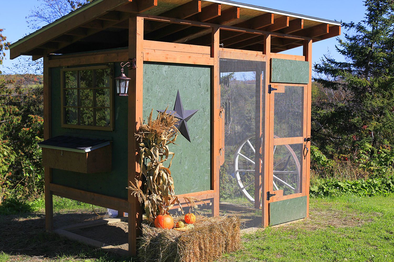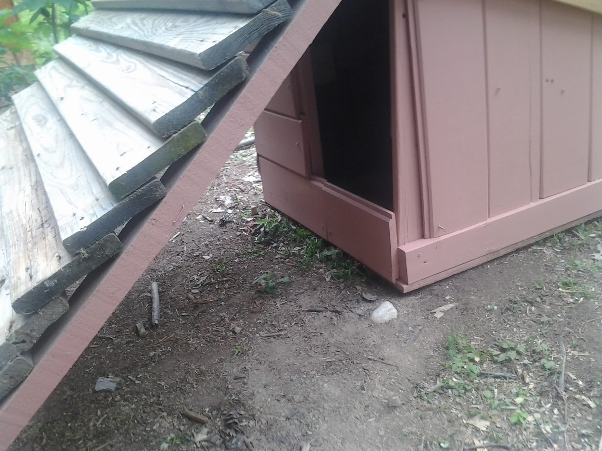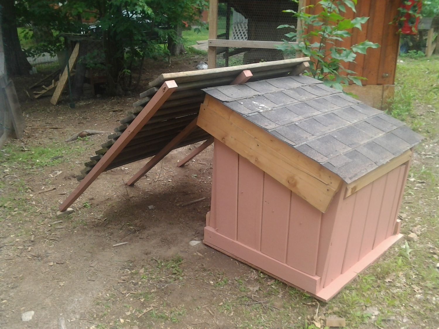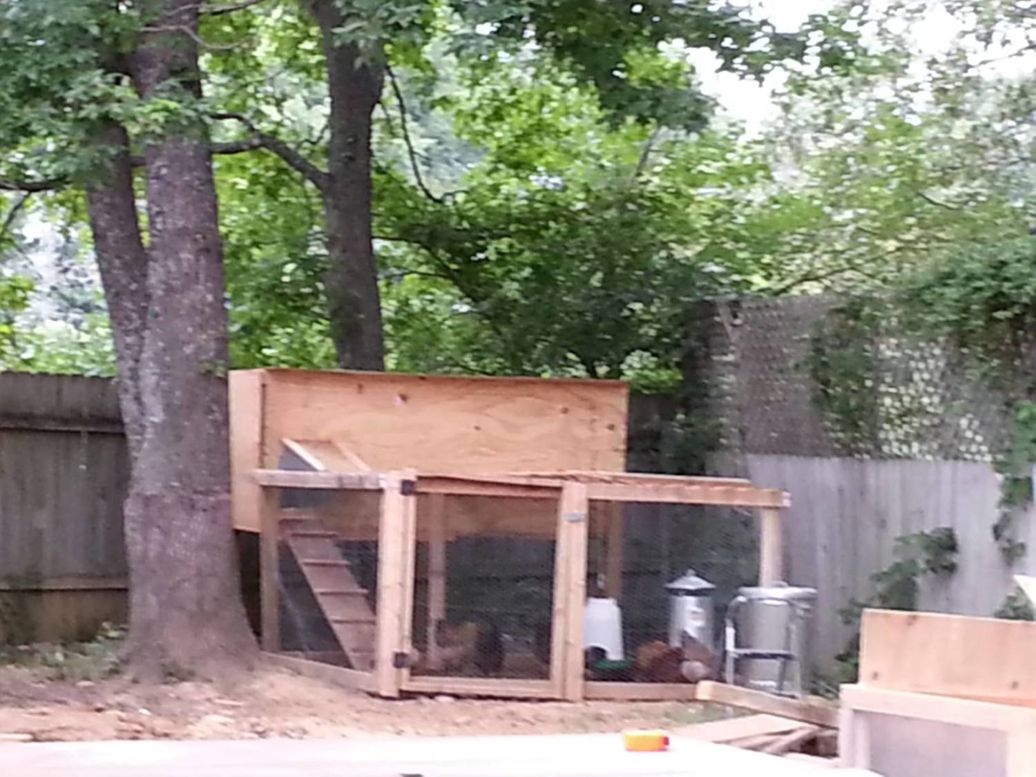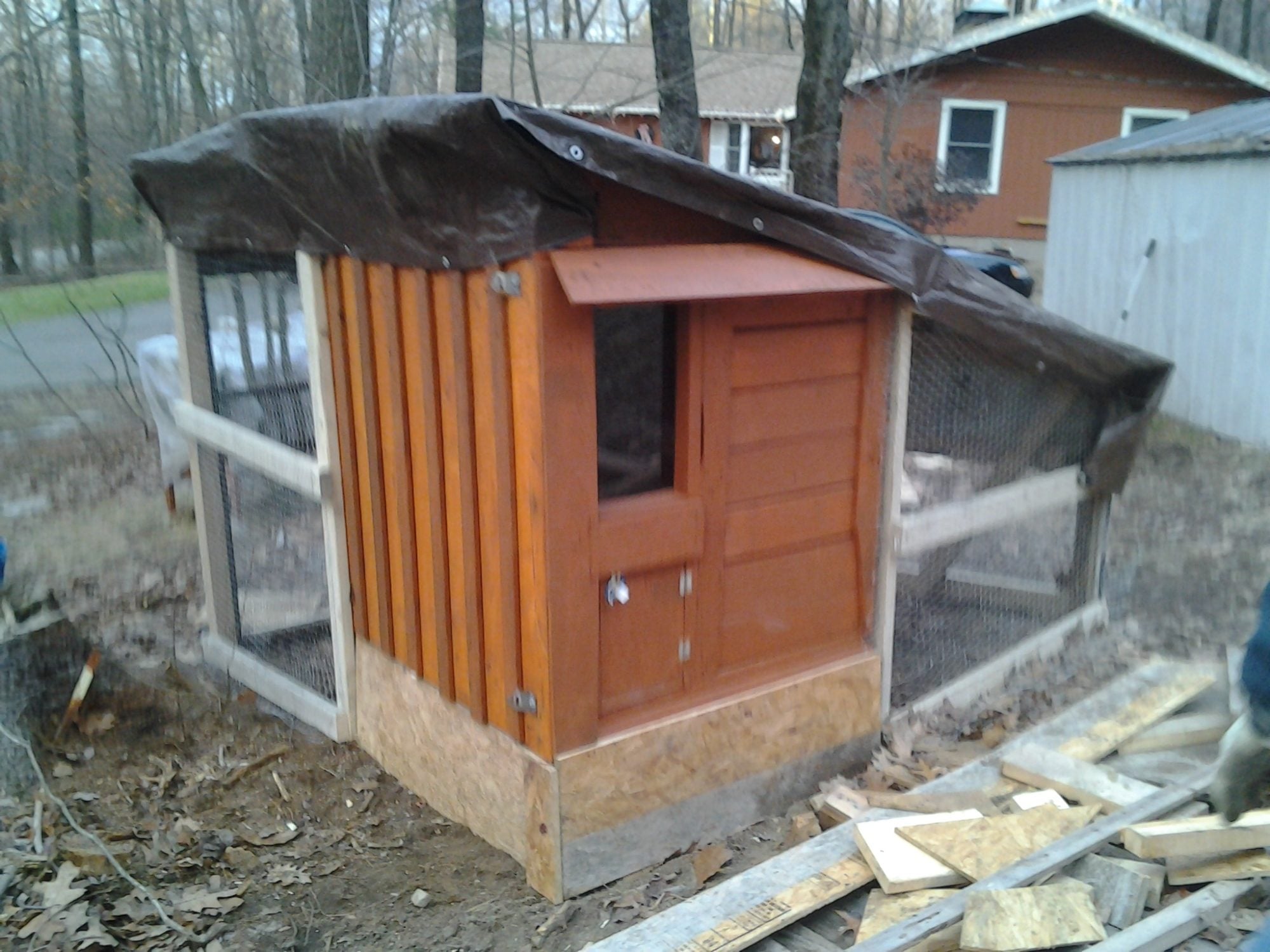 Houses 12 chickens without issue. We are going to add on to the run portion and raise the run upward to allow us to walk in and not have to bend to clean. Made from 2x4's and plywood didn't take to long to build. Inside the roost is an 8" closet rod. Nest box's are milk crates with bottom cut out except for about 2 inches to prevent the girls from rolling the eggs out.