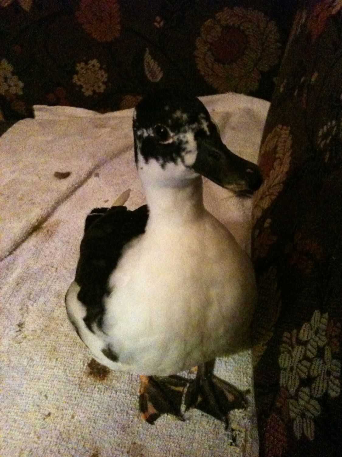 Sitting on the couch with me. Excuse the icky towel. You know how ducks are.