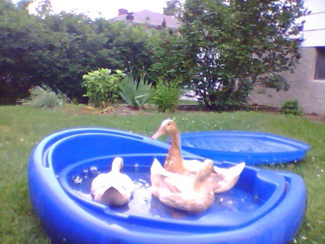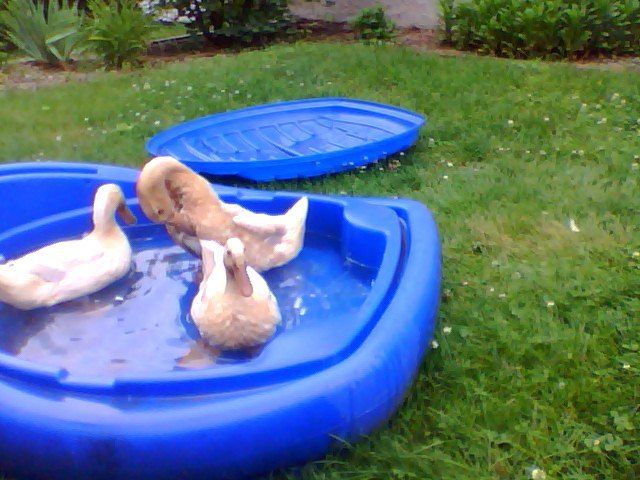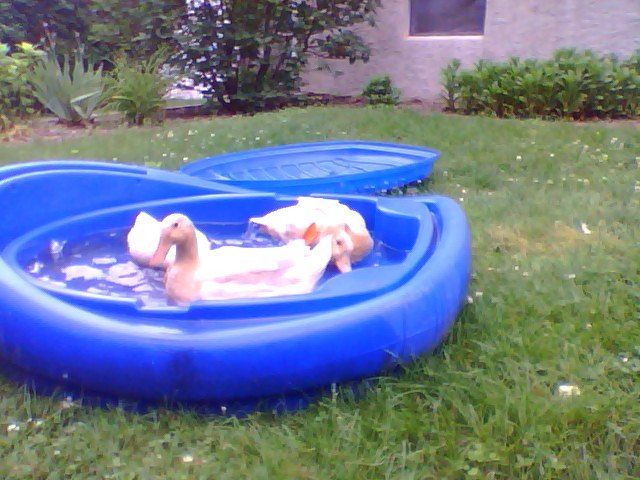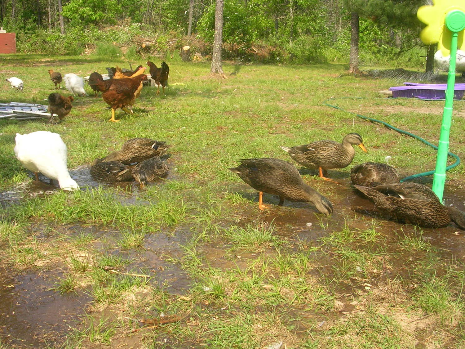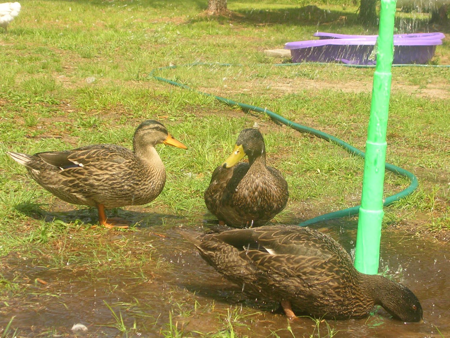 Here is Po my pekin , some of the mallards, and chickens enjoying the sprinkler. The chickens are 13 weeks old, Po is 12 weeks, 2 mallards are 11 weeks old, and 5 are 9 weeks old.