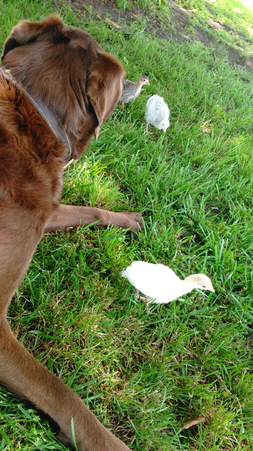 Now here he is with the blue slate and one of their keet buddies, under the watchful eye of my Chesapeake/Labrador.