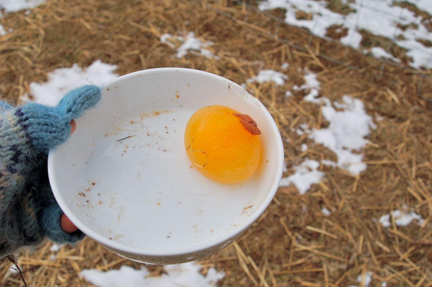 I've never had a shell-less egg before, but I've heard of them. It came with a big, nasty meat spot attached to it. I also think I know the chicken who laid this egg. She's a red sex link named Muffin who has calcium absorption trouble. I leave out oyster shells most of the time and supplement with egg shells if I don't have oyster available; Muffin eats just as much of them as the other girls but her shells are always extremely thin and brittle. Multiple times I've gone to crack an egg and the shell broke so fast it slipped to the floor. Not to mention her and the other hens sometimes eat her eggs (I've only ever had them eat Muffin's eggs) because while moving the eggs around the nest the shell will break, and we all know that that bright orange yolk is irresistible.