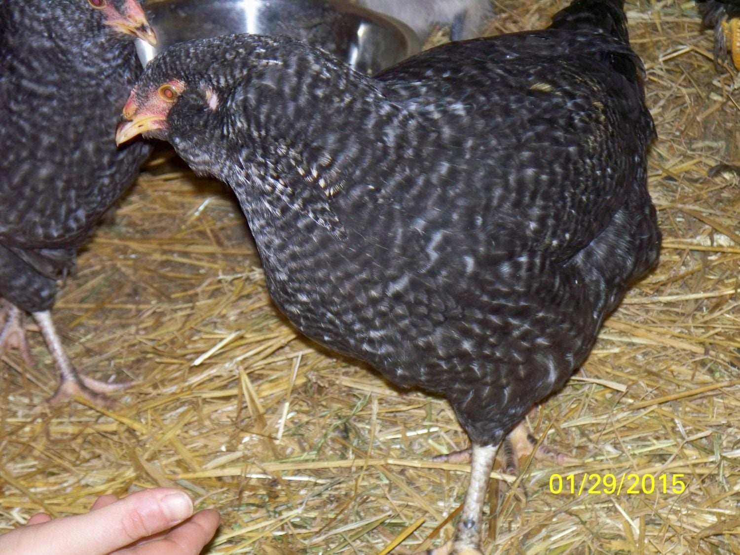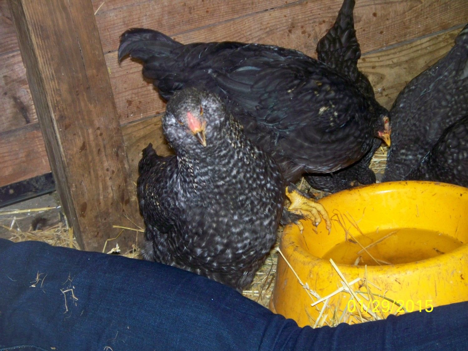 so two or three of the 5 of these have muffs. thinking EE/barred rock crosses. I think they are all hens but they stayed bunched and the cochin roo seemed less than thrilled with our picture taking so he wouldn't get out of the way. they have next to no comb but seem a bit large to not have a comb yet. I know nothing about EE but I know my barred rock roos I have already have huge combs so I am lost.