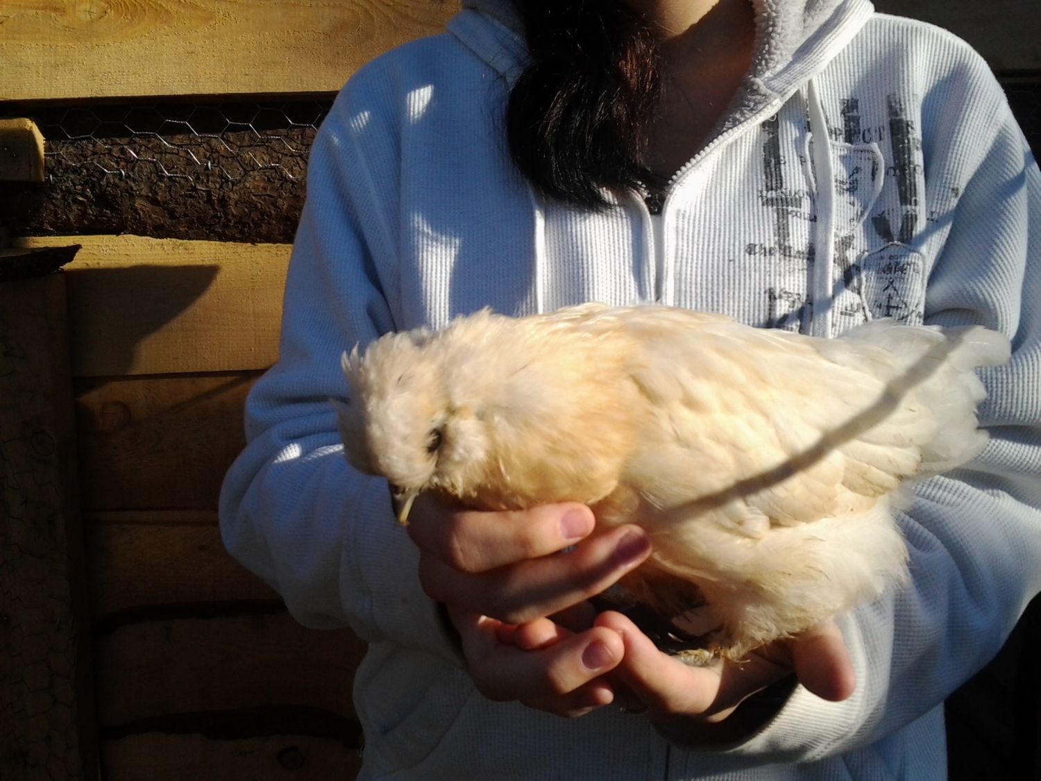 The light one has the poof on the head...but, the feathers are, again, feathers and not so much fur. She has feathers on her feet...but not really very much. I do think she is a pullet.