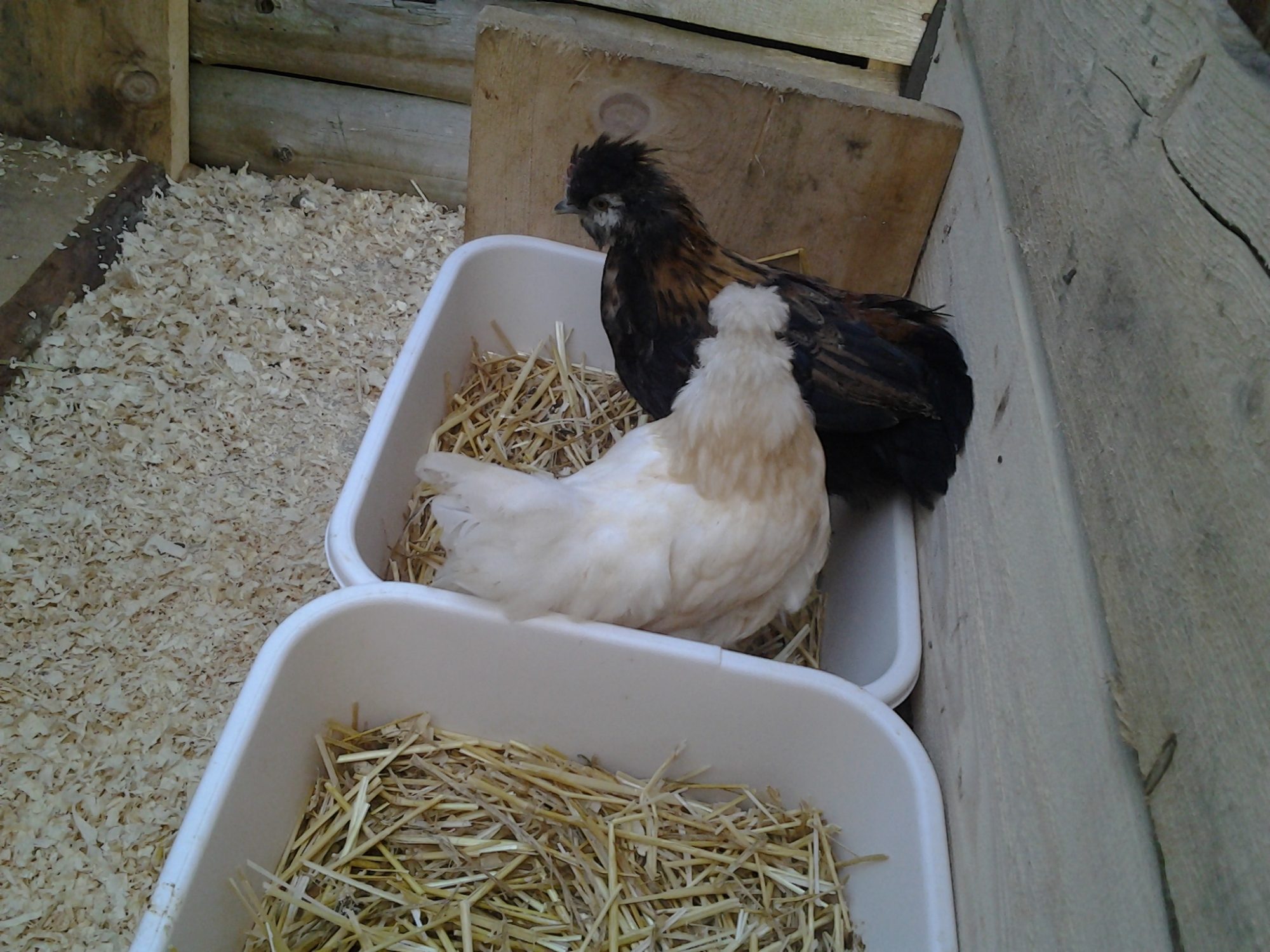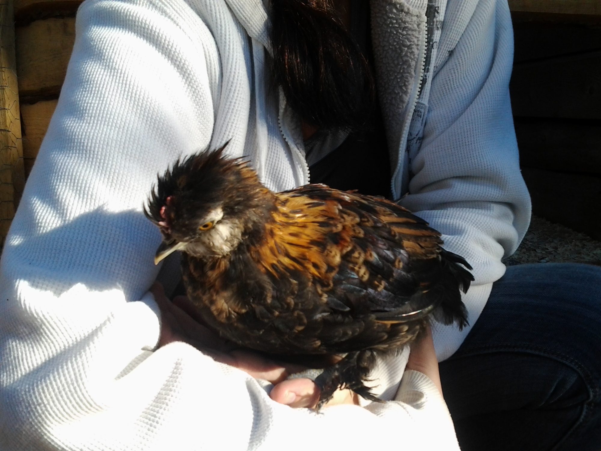 the dark one has a single comb...and no real poof on the head...but, kind of a mohock. He has feathers on the feet. His feathers seem more like feathers and less like the "fur" that a silkie appears to have. She thought he was a cockrel...I'm not so sure. his tail feathers are short and don't seem to "flow" like a rooster's do and the neck feathers aren't as long?