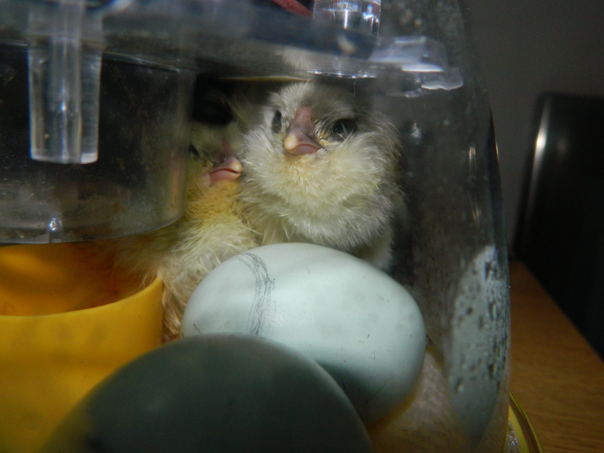 I woke to two more chickies! Another Blue Ameraucana, and a Black Ameraucana! They are rumbling around the limited space, and keep turning the other eggs over...