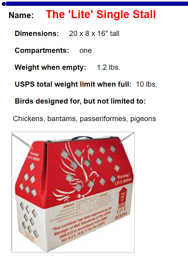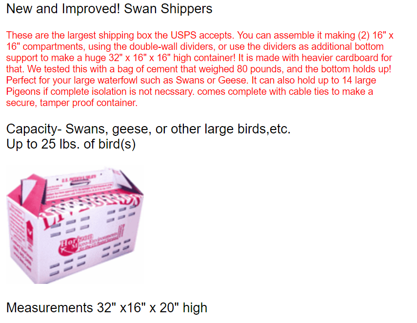 SHIPPING CONTAINERS: The special USPS approved adult bird shipping boxes we use come in three sizes. The larger ones cost $26-$28 each and will safely accommodate 6 to 8 Bantam ducks, 3 to 4 larger ducks, 2 Shetland geese, or one larger goose. The medium size boxes cost $16 each and will hold up to 4 bantam ducks. The smallest box costs $10 and will hold a pair of bantams.