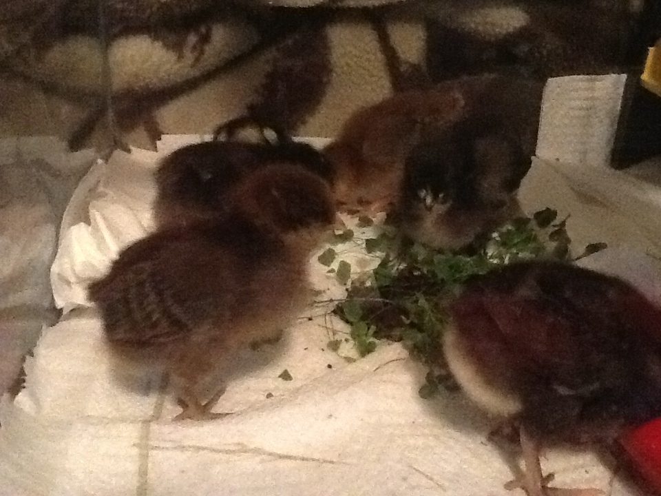 Sally, what a bunch of cuties!  Enjoy them. They grow fast. Pretty soon they'll be racing around and trying to fly out to go exploring. Did they like their greens, or were they too "chicken" to try them?  :D