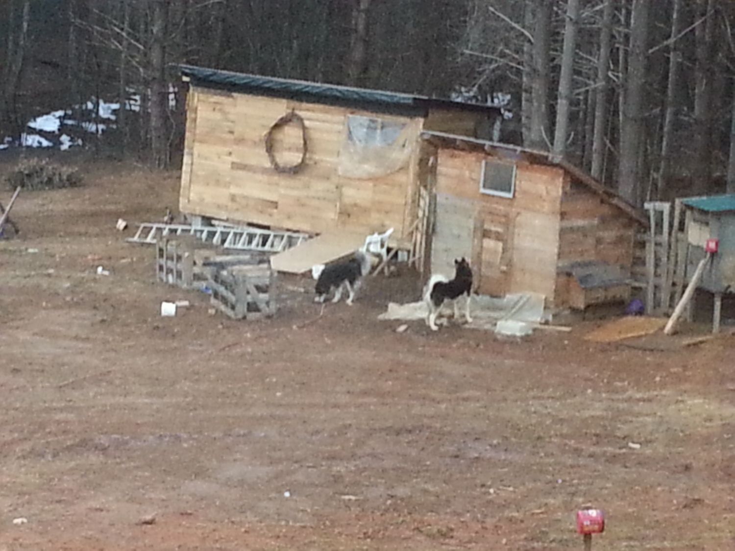 This is the best picture I have right now.... The little one that the dog is looking at is the old coop. The big building down the hill a little is the new one that we have been working on. I will try to get some better and closer pictures tomorrow. The building was originally build as a workshop for my husband, but he decided it was too small.Lindz-your coop looks great! Do you have any outside pics?