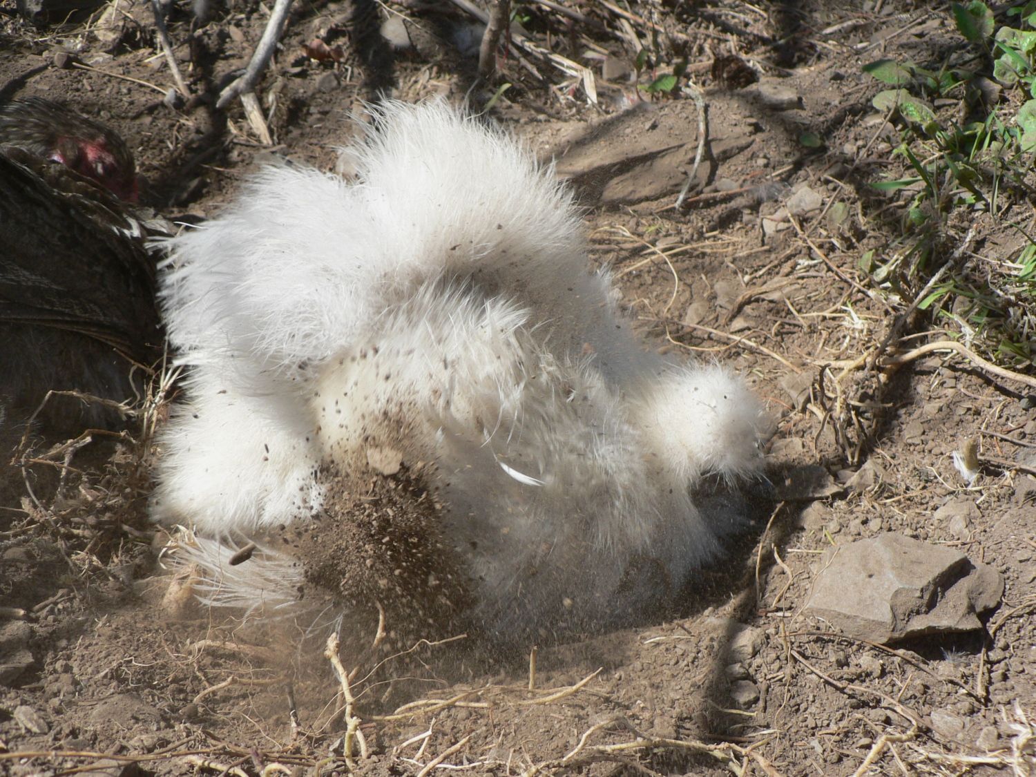 it's an all time record! technically... there's one who didn't lay, but she's excused for sitting on those eggs... today is the close of day 8 and she's looking gorgeous! I can tell she took a quick bath today, the earth by the kennel is hollowed out in a chicken shape.