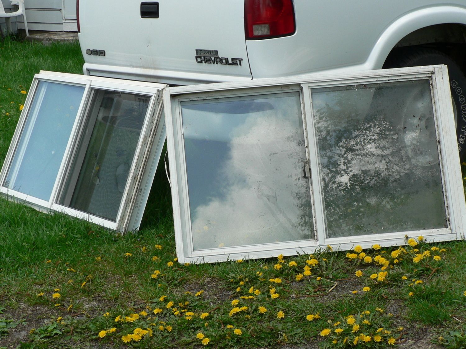 2 nice, heavy duty storm windows reclaimed from a dumpster, to modify the shed.