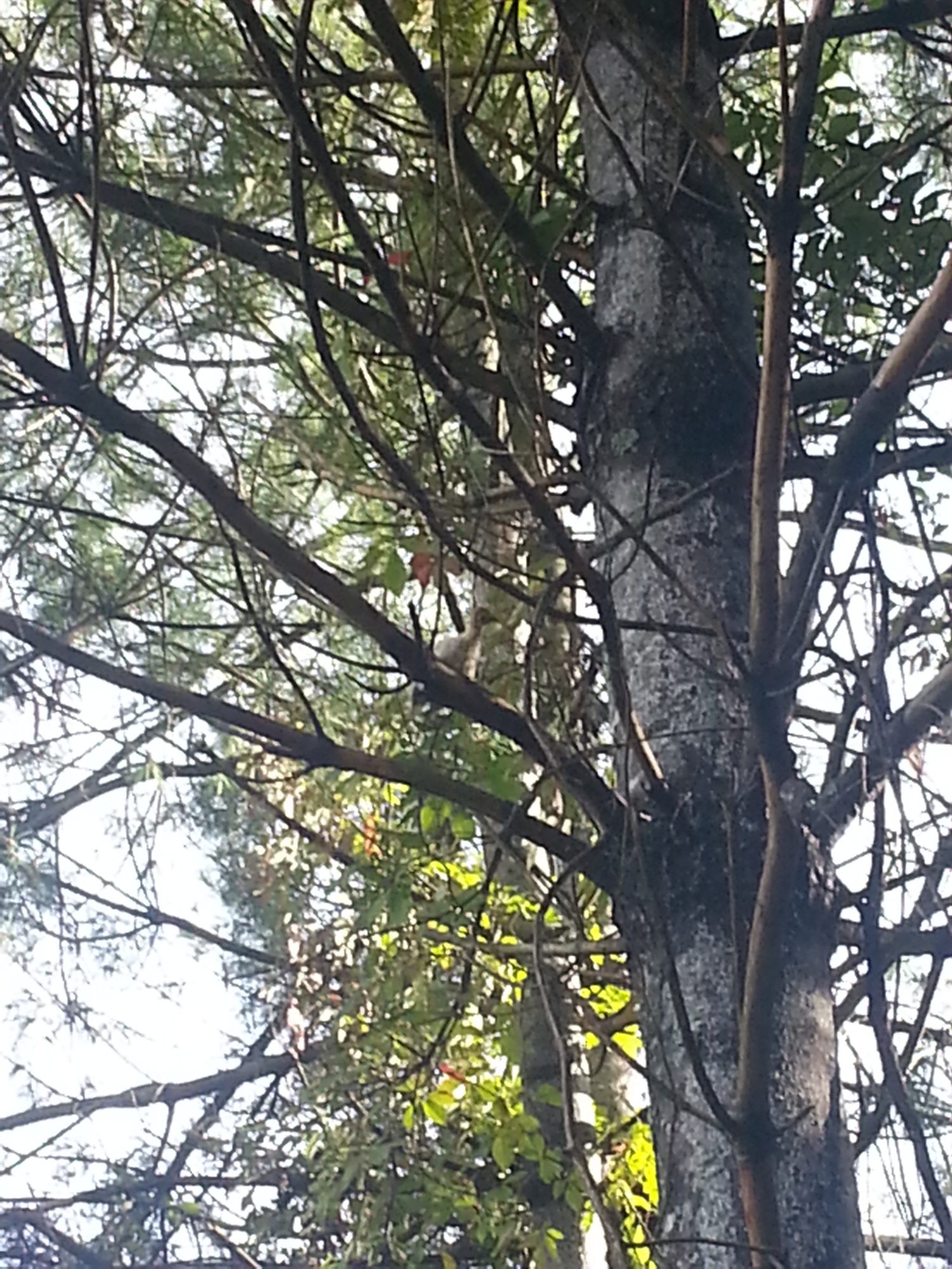 The escaped guinea keet..... about 25ft up in a pine!