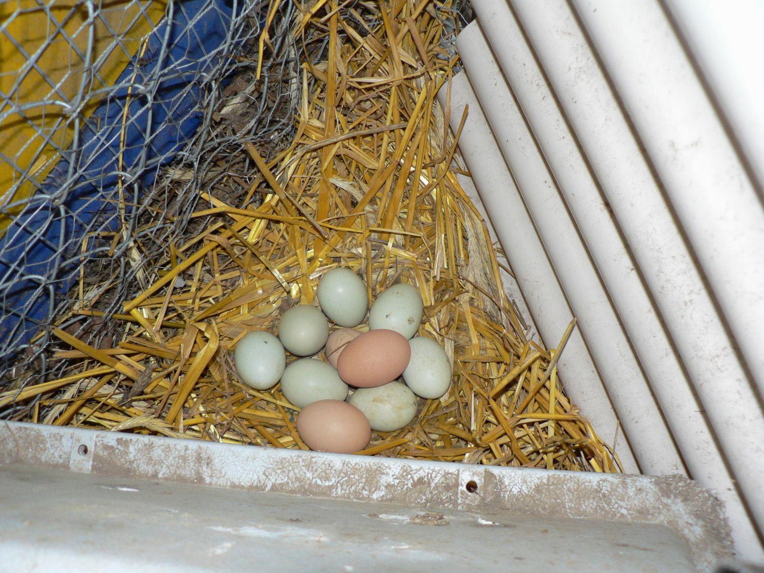 so... I'm a knucklehead. I forgot that the Fosters were using this corner as a nest. but I caught Fiona Foster back there this afternoon. the brown egg on top is only moments old in this pic. the other 2 brown eggs could be hers... I don't know, so I tossed them. the rest are PEACHY'S! Seven of them!