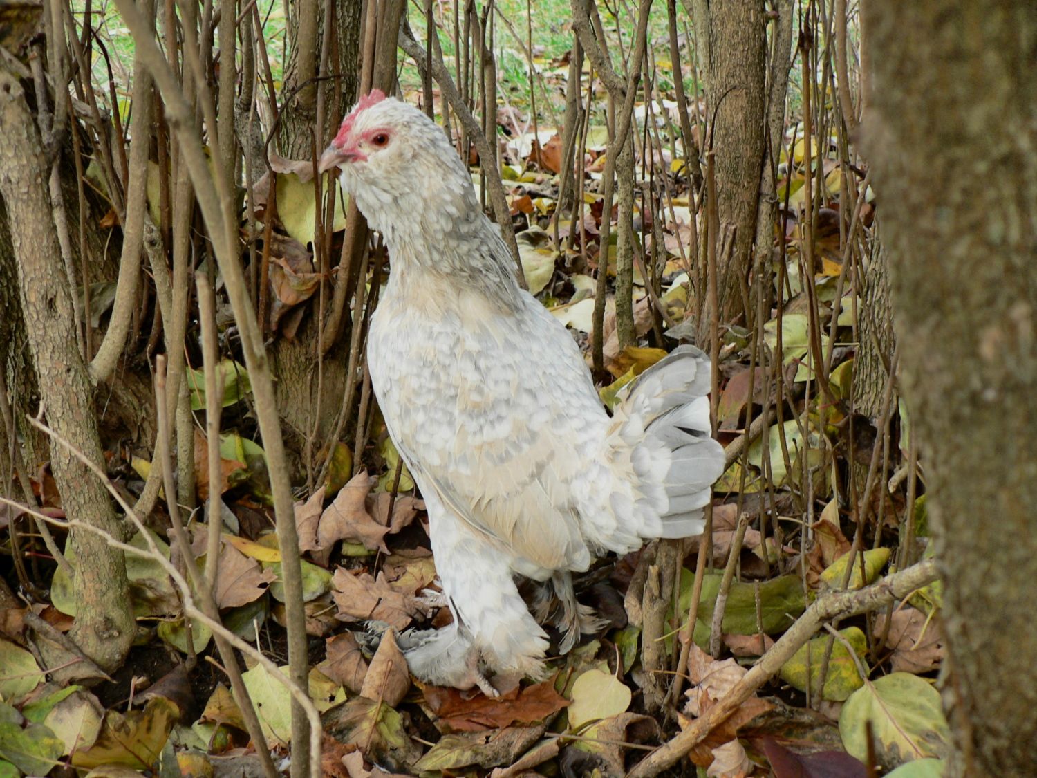 we had free range, I got home at 4, despite the rotten extra phone book work. it was really nice, mild, partly sunny, the flock was loving it after being penned for 5 full days due to rain. after everyone essentially put themselves up, I offered free range to the new girls. this one is the only one who took me up on the offer and she explored a lot of territory. the other two are so silly. they stayed in the pen, dashing back to the kennel nest every time I came nearby... but they were happily roosting at sundown so I know they're settling in well.