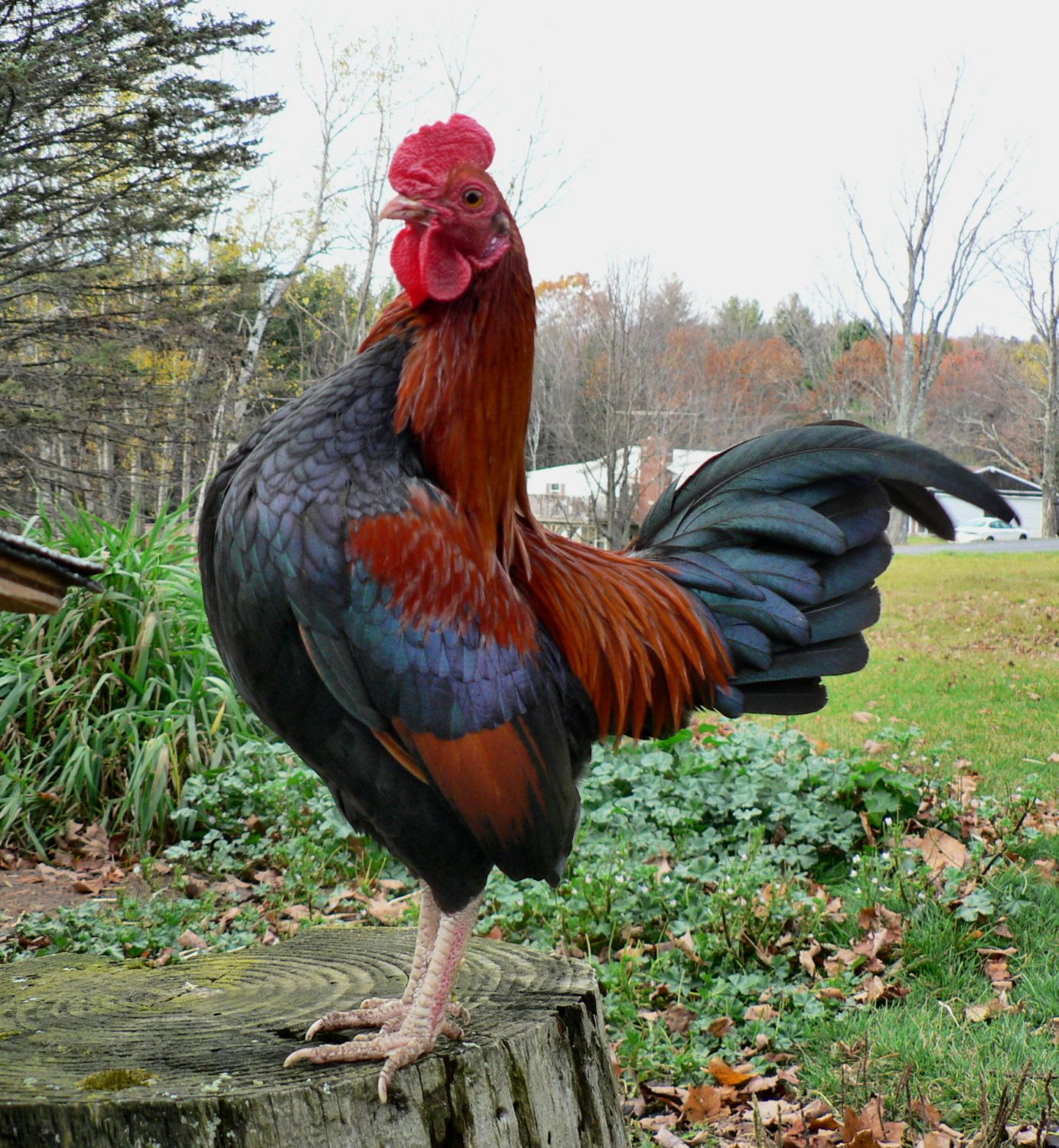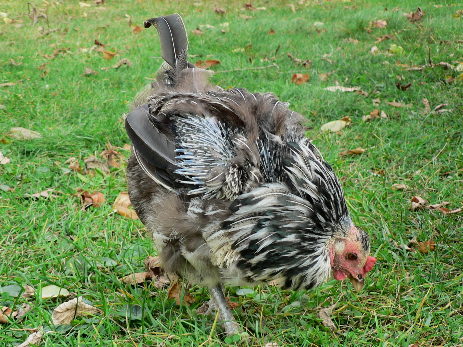Haha! Poor Yancy. It must be really itchy. I have a SLWyandotte that looks very similar, but Grumpus is always grumpy, so no big deal. I love it when the last few tail feathers hang on like that!