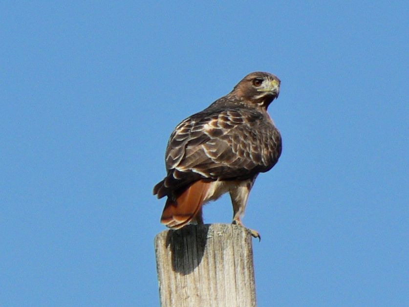 Never had a red tail get low enough to be threatening. We have some very aggressive scrub jays guarding their yard. It is acorn season, and they are busy planting acorns all over the property. They only recover about 50% of them, and most of the rest will sprout into unwanted saplings this spring.