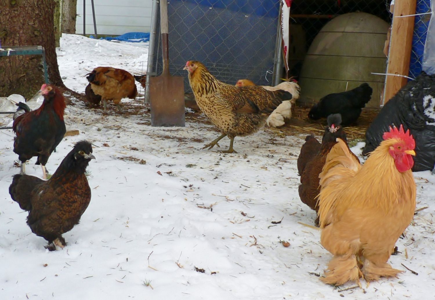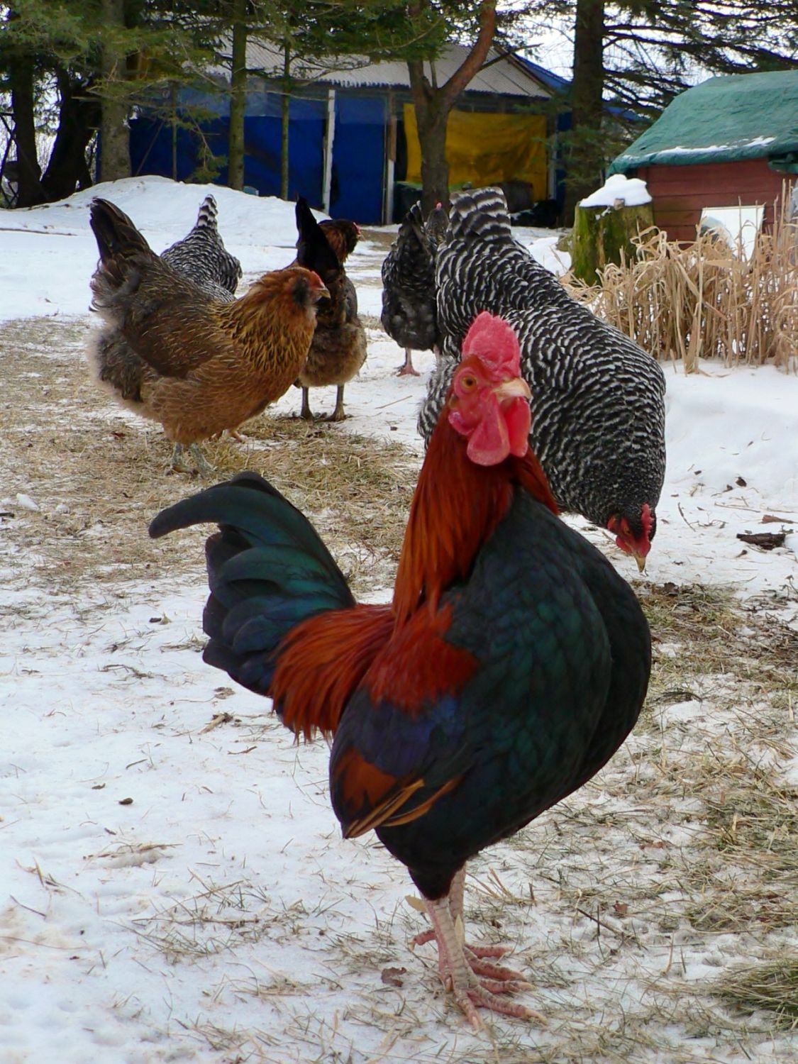 that's my day in a nutshell. up at the (butt) crack of dawn, sunrise was spectacular... the flock was still roosting for the most part, a few roosters crowing since about 4:30 didn't really rouse anyone, but they were all quick to get up when I came in with an early breakfast. spent all day together. first time in a long time the weather was nice for free range. only Gossamer didn't come out. she's still broody.