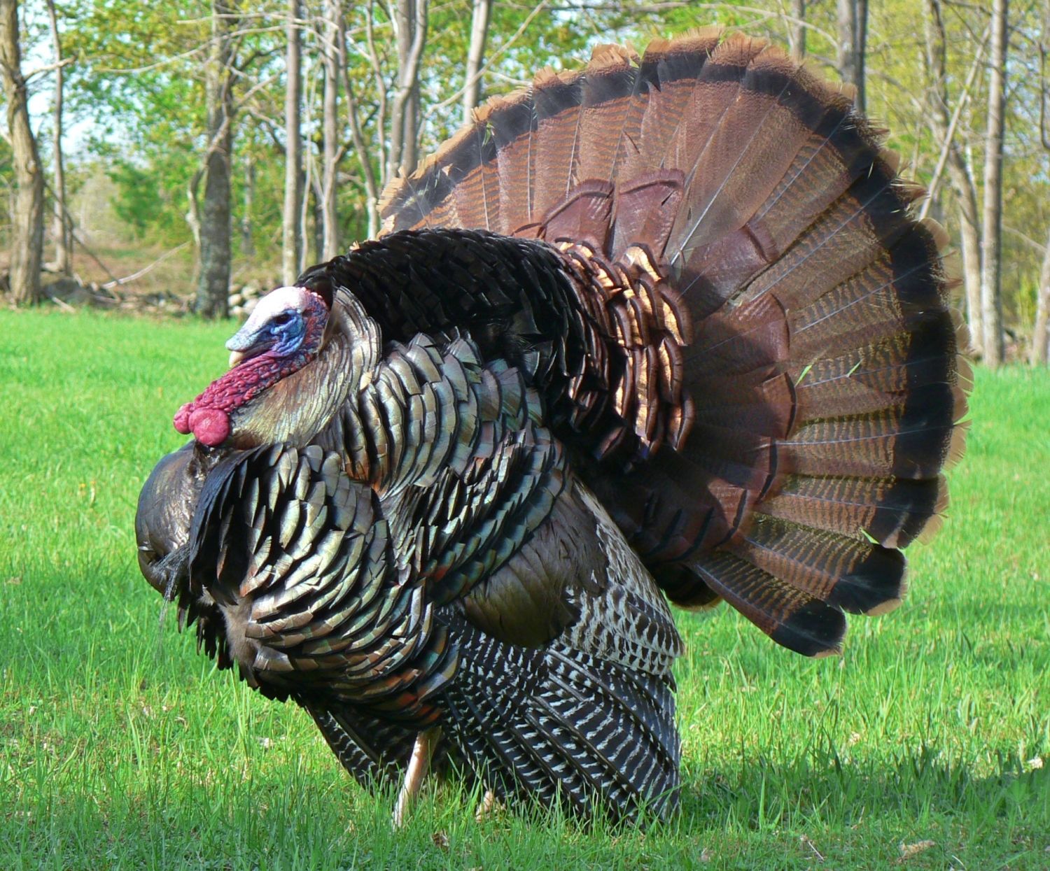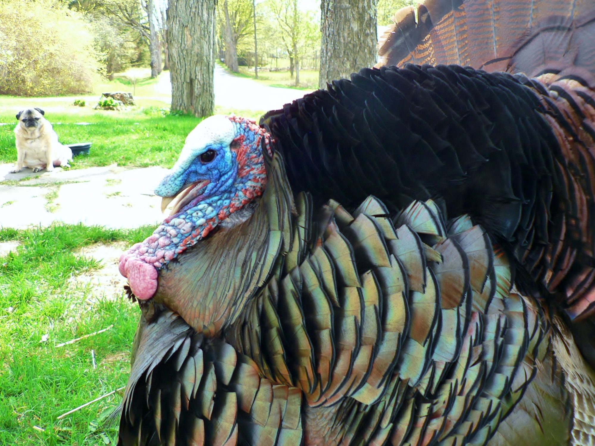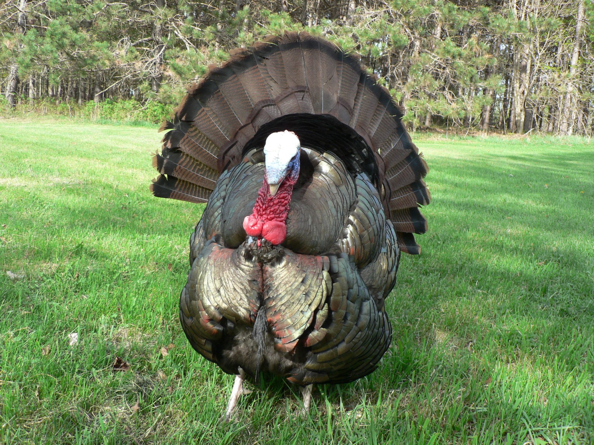 he's young. his spurs are maybe a bit over an inch long. his beard is ratty. but his fan is great.