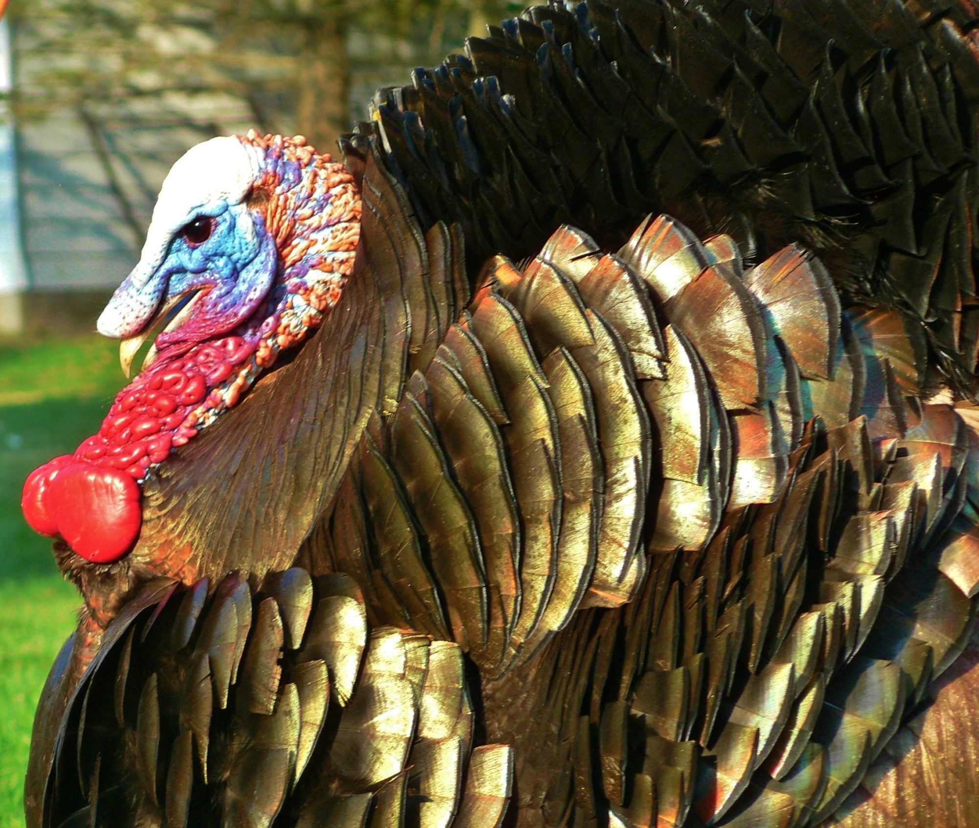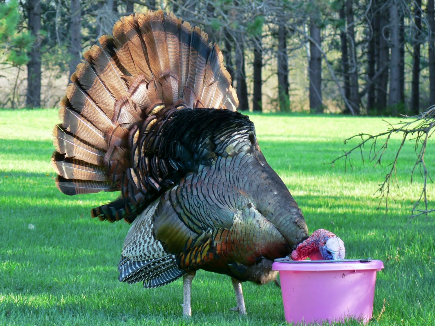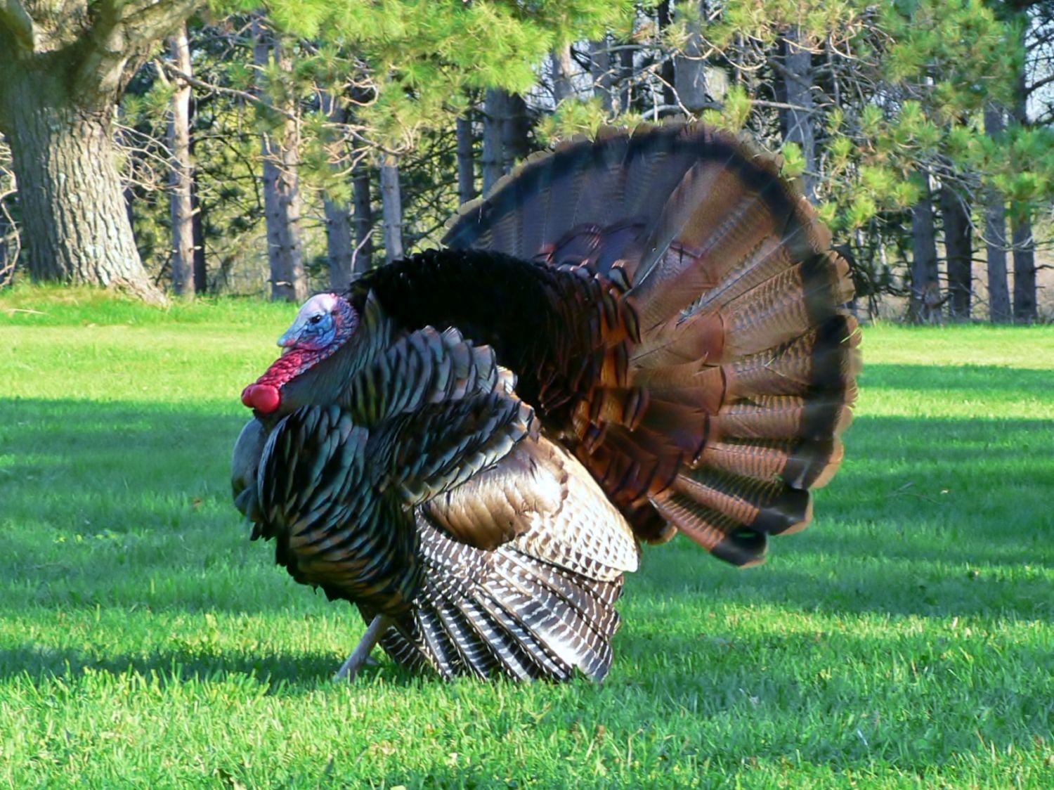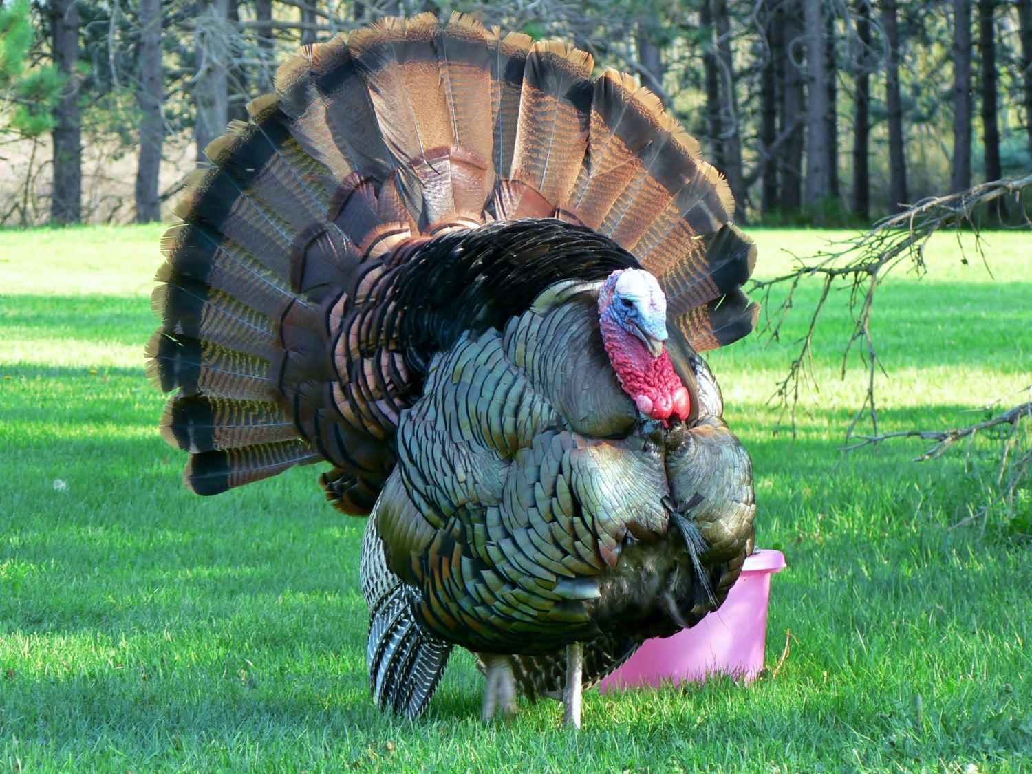 he's young. his spurs are maybe a bit over an inch long. his beard is ratty. but his fan is great.