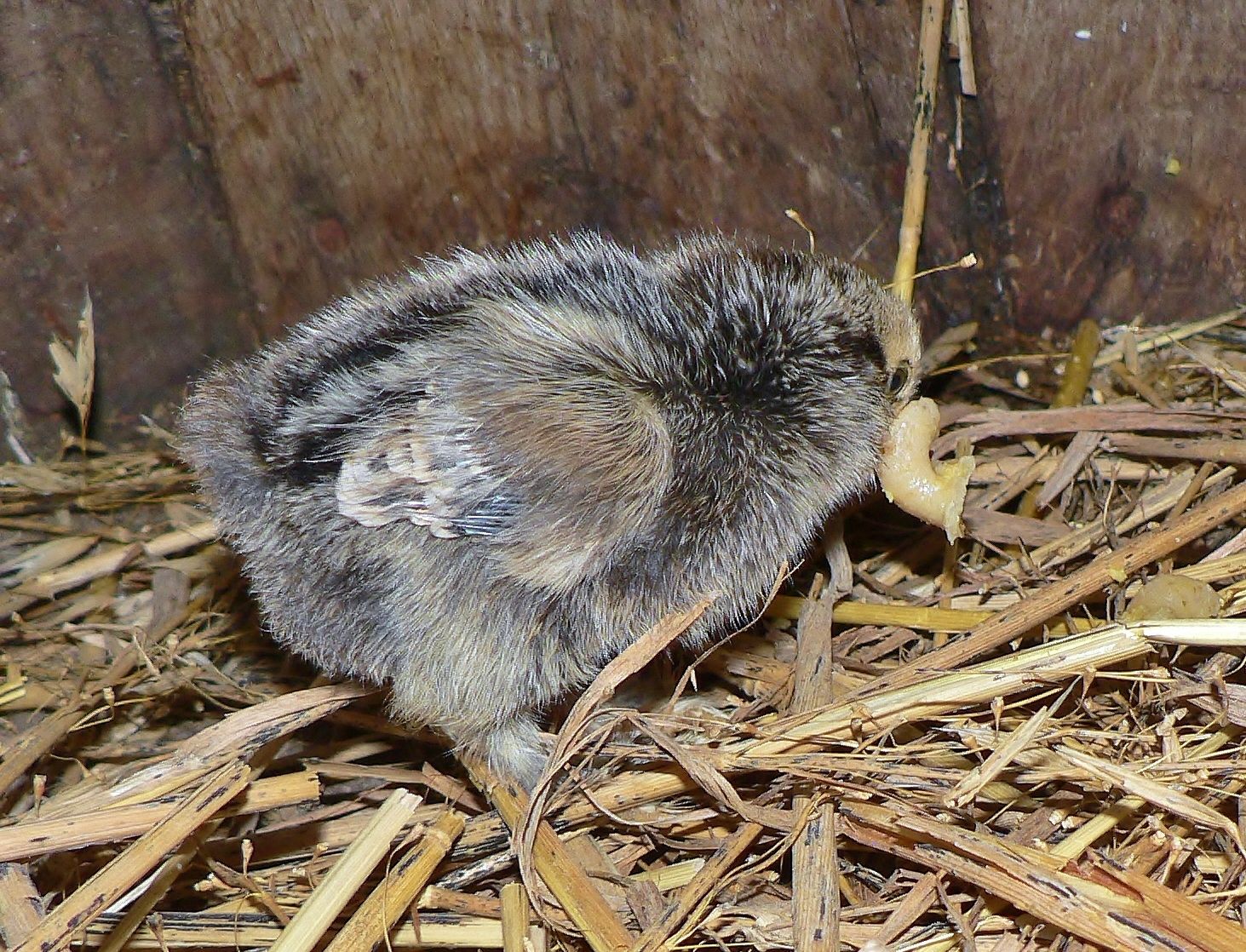 Goldie is thriving under Mama's care! getting little wing tips already... this is probably "her" 5th Pie... helping herself - she's an ole Pro now... the little brown chick waited for Esther to drop tidbits...