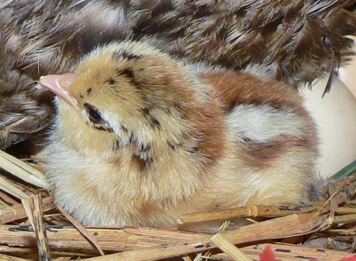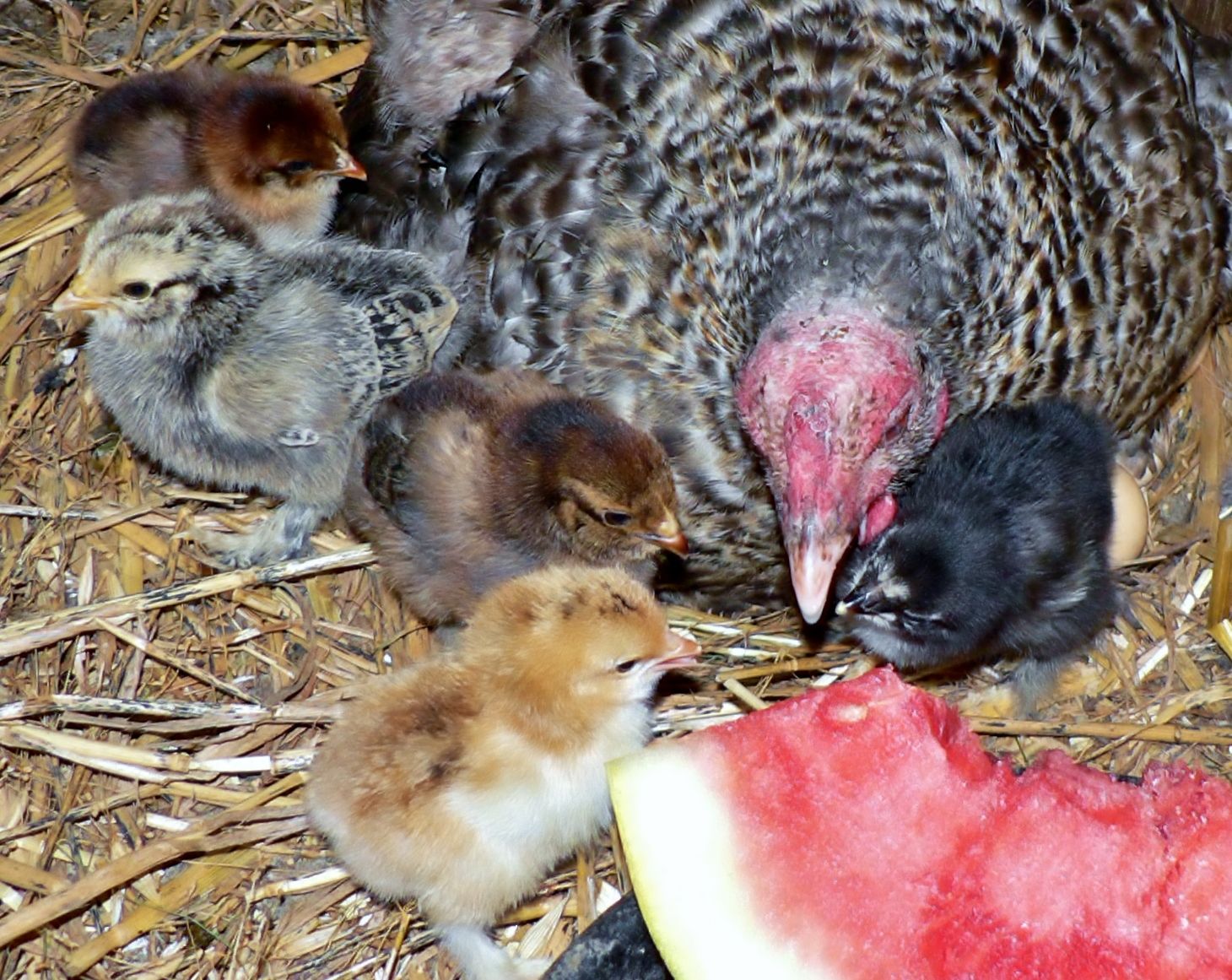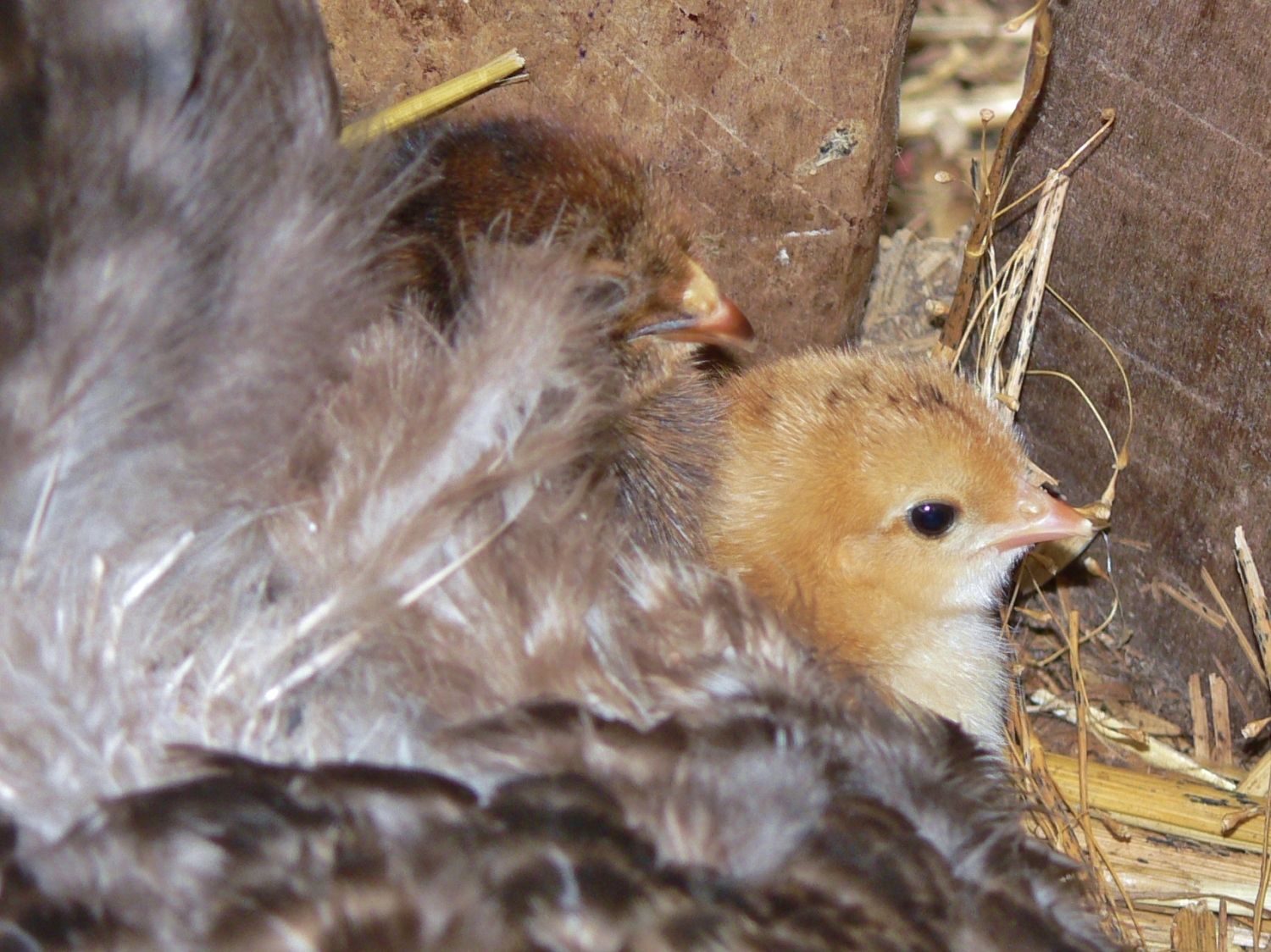 the last little black chick is under Mama's right wing.