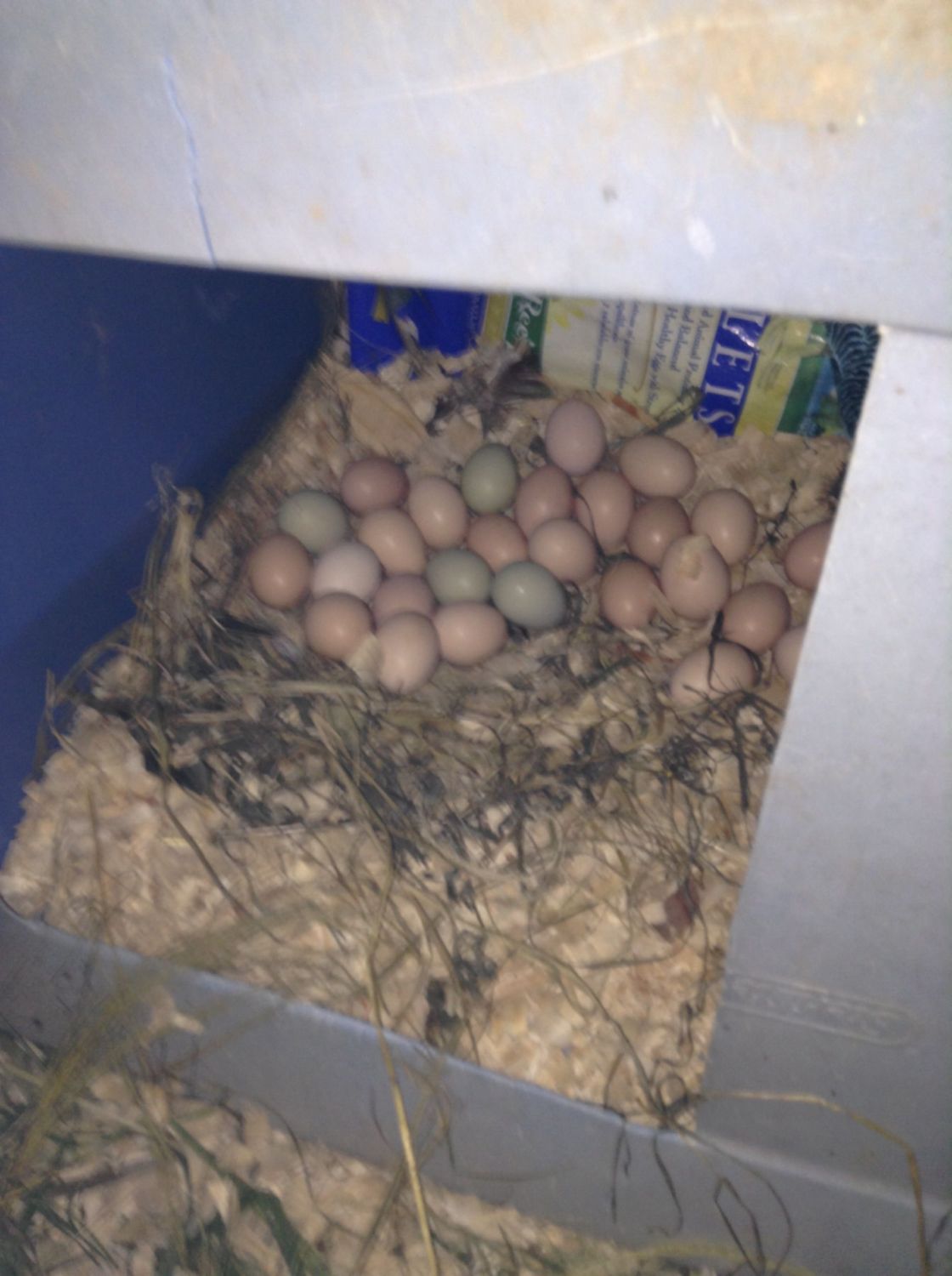 I checked the chickens, and there were five on the roost. Worry for Bonnie made me enter. I found one egg on the ground, and every single other egg in the one nest box. It's a small (maybe 20 gallons) tote with half the lid cut out. It was a brooder a few years ago. I put it in for the turkeys to get out of the sun or nest. Now it is where I want the chickens to lay. I can't believe that they all used it the whole week, and in one pile! They were still laying under the box I built for sleeping in when I left!
