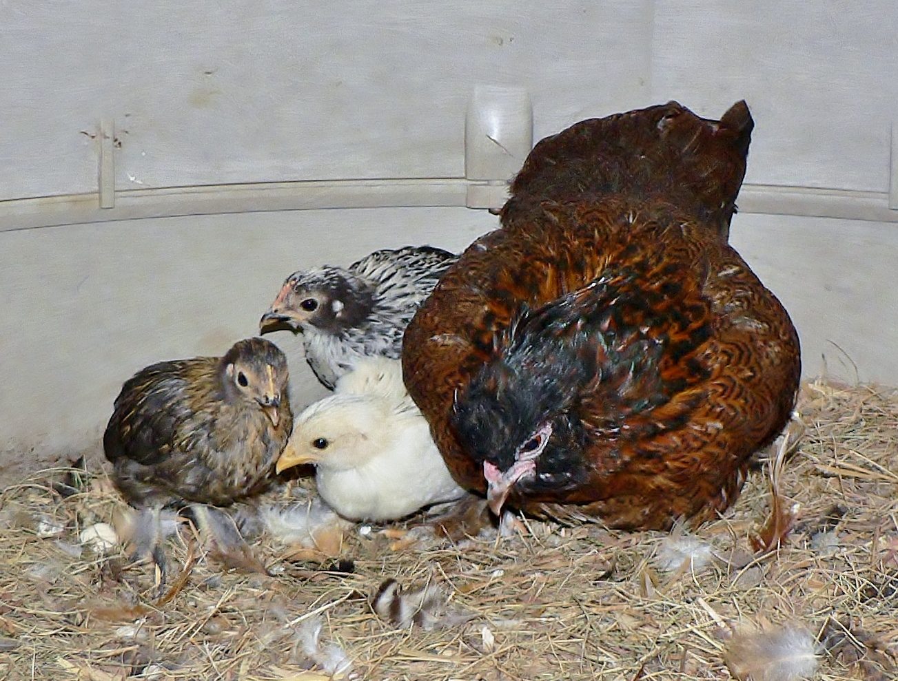Mama Cressa and her babies, I see 2 pullet and 1 cockerel. it will be at least another week for Gossy's chicks to start being sexable.