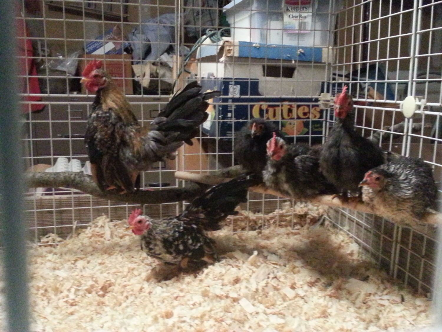 Not much news on the chicken front. Still 4 very determined broody Seramas and one zombie broody Orpington. The chicks are growing up, and crowing, but it's not too bad. I want to keep them as long as possible to see how they turn out looks wise. Still haven't gotten new pics. Except one on my phone. Very fuzzy and doesn't show hoe pretty the 2 smooth feathered boys are. Not a fan of the ones with silkied feathers.