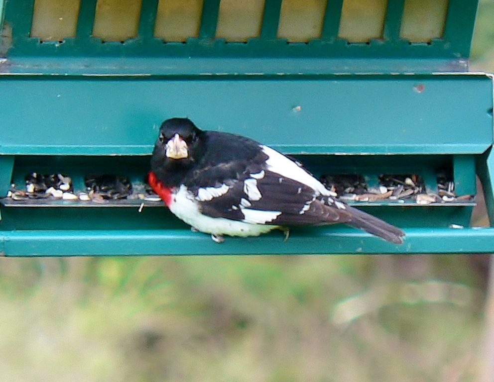 a red breasted grosbeak with a beak full - I ate all kinds of healthy food today too...