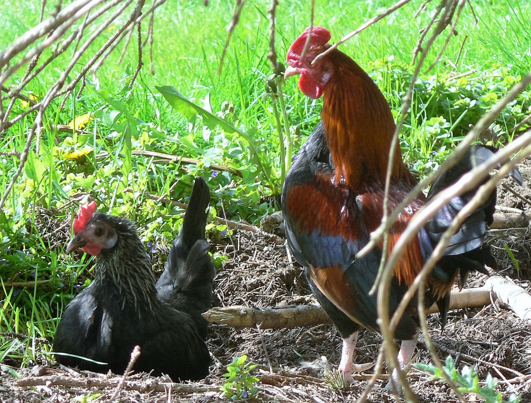 This morning, I took Bueno over by the free ranging hens to see how they'd react. One of the older hens was very interested in him. She kind of sidled over to him and dropped a wing!! Little hussy. And here I was thinking she was going to pulverize him! He did his best tippy toe crowing, scratched all around and offered up treats, which created much interest, but no takers. He's still significantly smaller (about 10 wks now) and still peeps so not really threatening, and it seems they will accept him just fine. We sat out under the oak tree for about half an hour before crazy broody Stumpy came screaming out of the coop, ran over to where the hens and Bueno were hanging out, and promptly went after him!! He dodged away from her, strategic retreat, but held his ground, the good boy. I was tempted to leave him out there with the girls, but when I walked around to the other side of the tree to check the water, he came running after me! So after a brief consultation, we decided he should go back into the brooder pen. He was well received since he brought the other chicks some kale leaves. Good thing I'm not attached to this little guy.