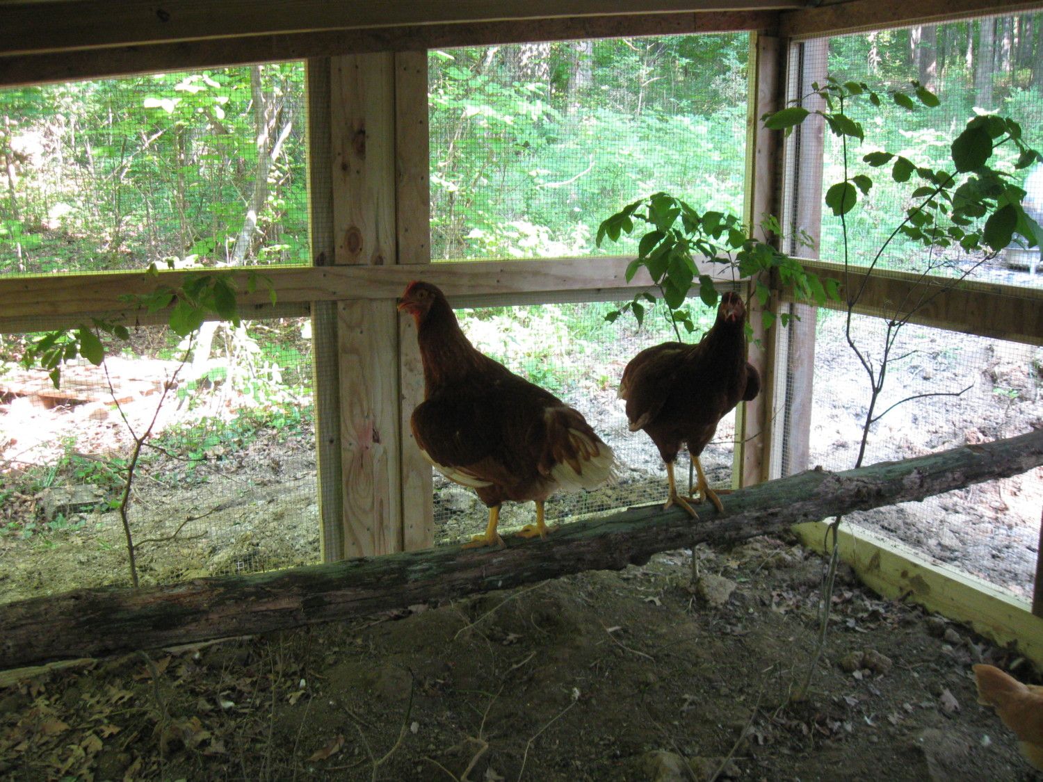Here is a picture of my roost pole. I originally went into the woods to find a club to clobber Roger with and changed my mind so I converted it into a roost/rest pole in the run. Works great and free.
