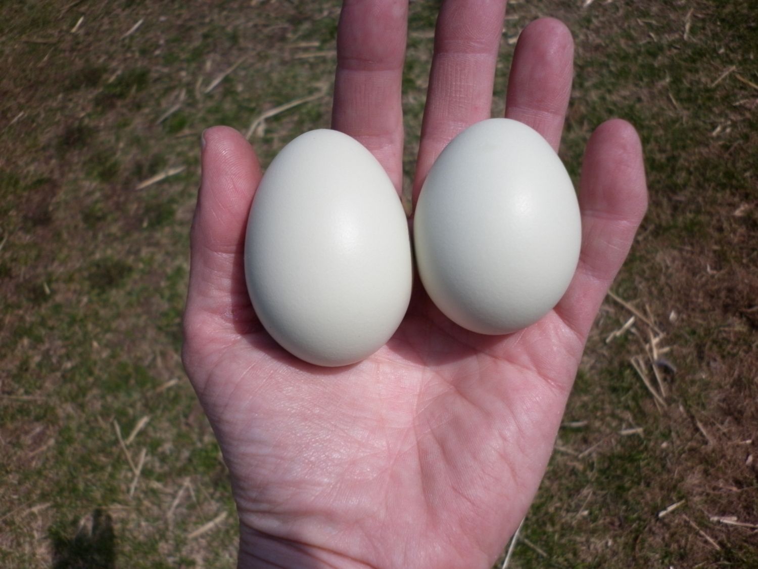 of the eggs in my hand, the larger is Olive's, the smaller is Peach's. Olive has either graduated to laying larger eggs, or it's a double yolk!