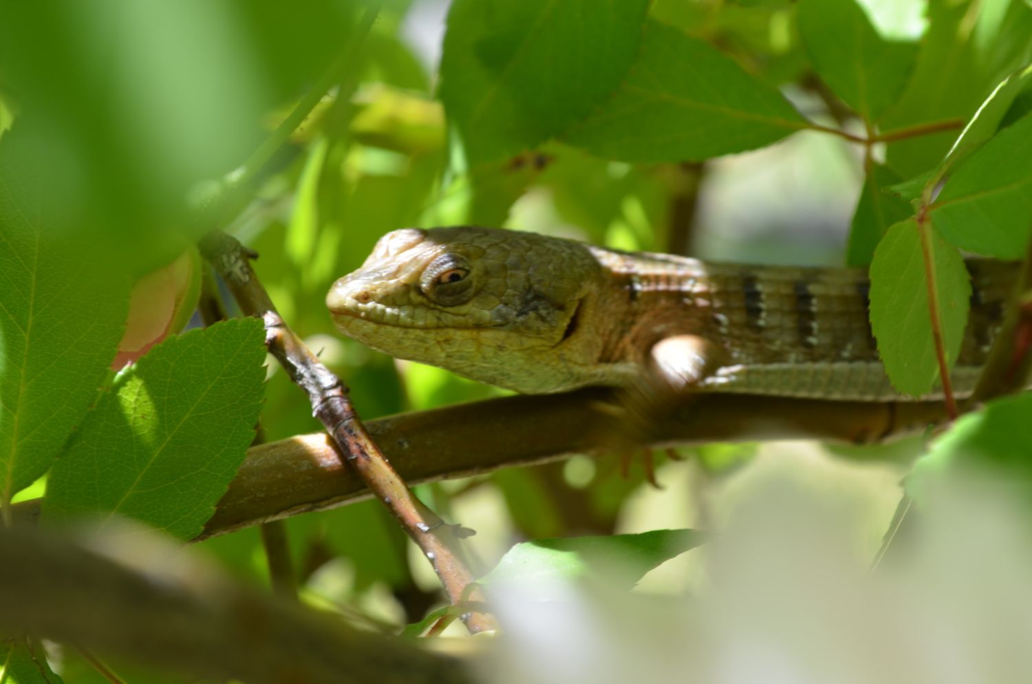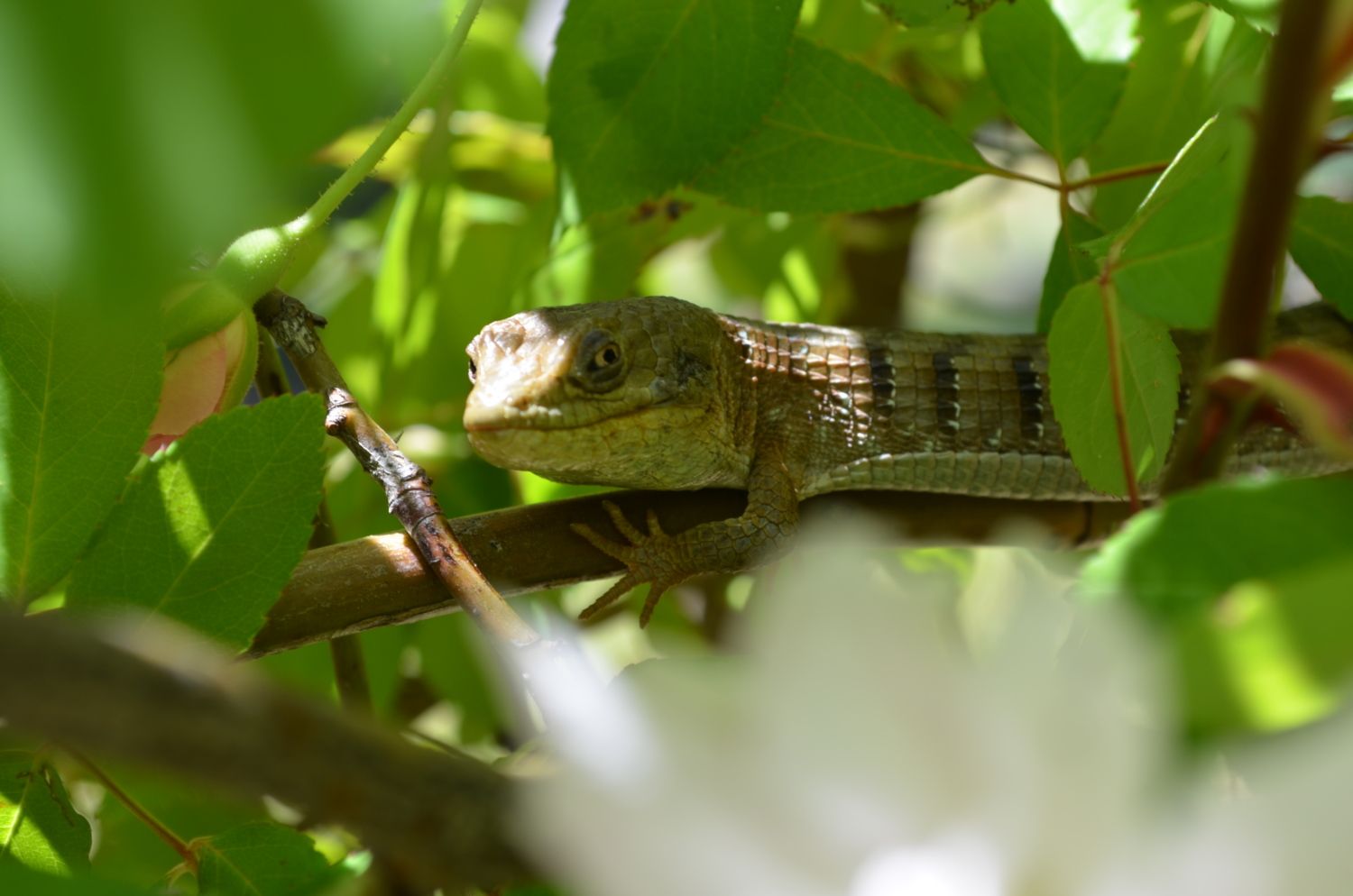 Back to watering I went, little knowing that my reptilian adventures were not over. Went to go take care of the climbing rose that had been blown down in the wildfire-inducing hot high winds that we had been having. I propped up the rose and retied what was left of the broken makeshift trellis, put the water on and decided some serious pruning was in order. Merrily snipping away, I was following a cane back down the maze-like tangle of rose stems, and was confronted by yet another glaring reptile... the biggest alligator lizard I have ever seen! Had to have been over 8 inches long, and it was not happy being awakened from it's nap. It was even less happy when I started prodding it with a stem to move it into a better position for pics! Very glad I had been wearing my anti-thorn gloves, because when these guys decide to go after you, they have an uncanny ability to grab the fold of skin between your thumb and forefinger, and no amount of flailing and shaking will get them to release. The lessons of childhood are hard earned!