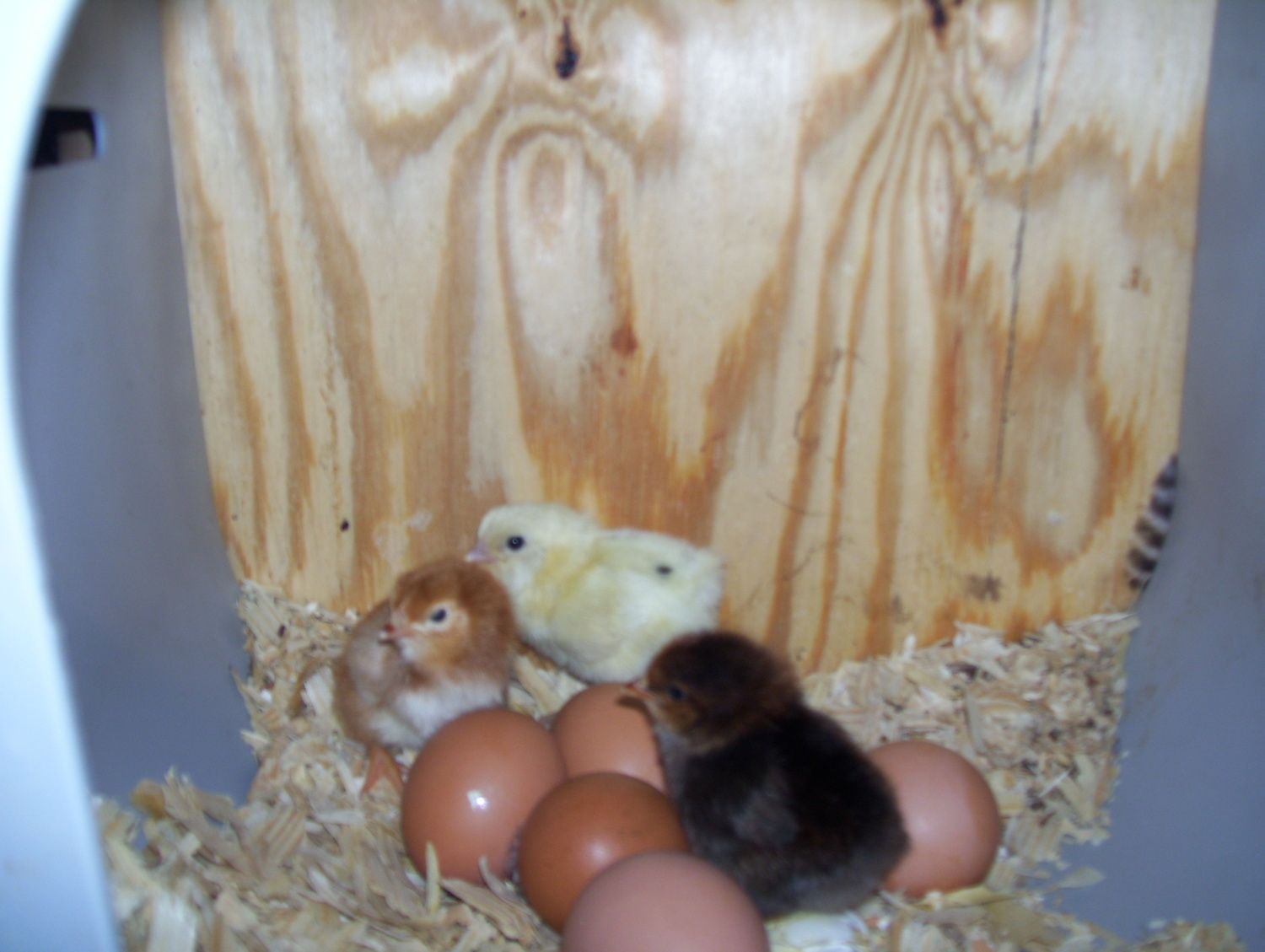 All three babies, and five eggs. Only one should be there. The Golden Buff is getting on my nerves. I am really hoping Baby gets these babies out of the box, and onto the floor tomorrow.