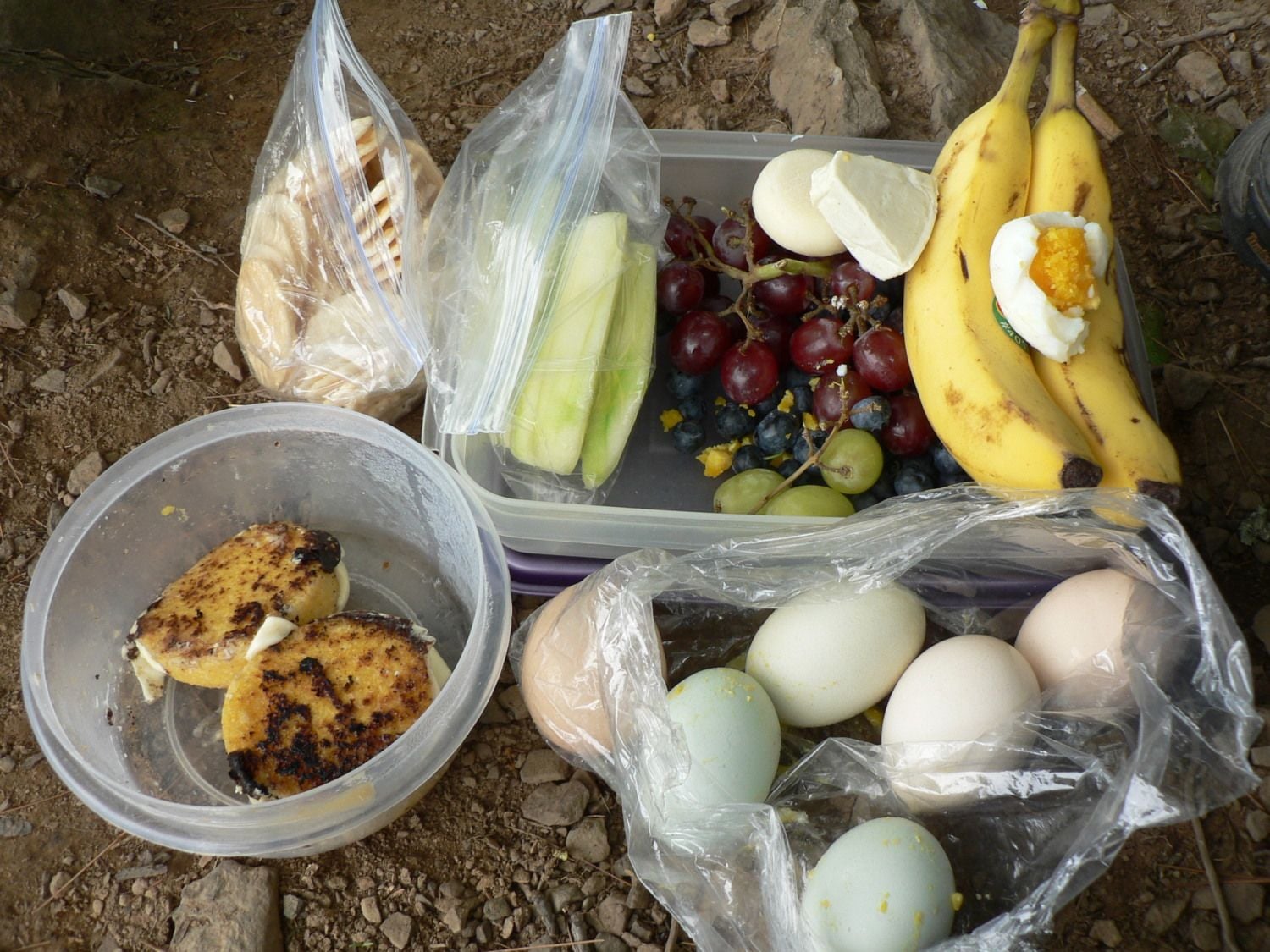 our picnic, there are polenta cakes, boiled eggs, cucumber slices, green and red grapes, blueberries, cheeses and crackers and bananas. we ate it all.