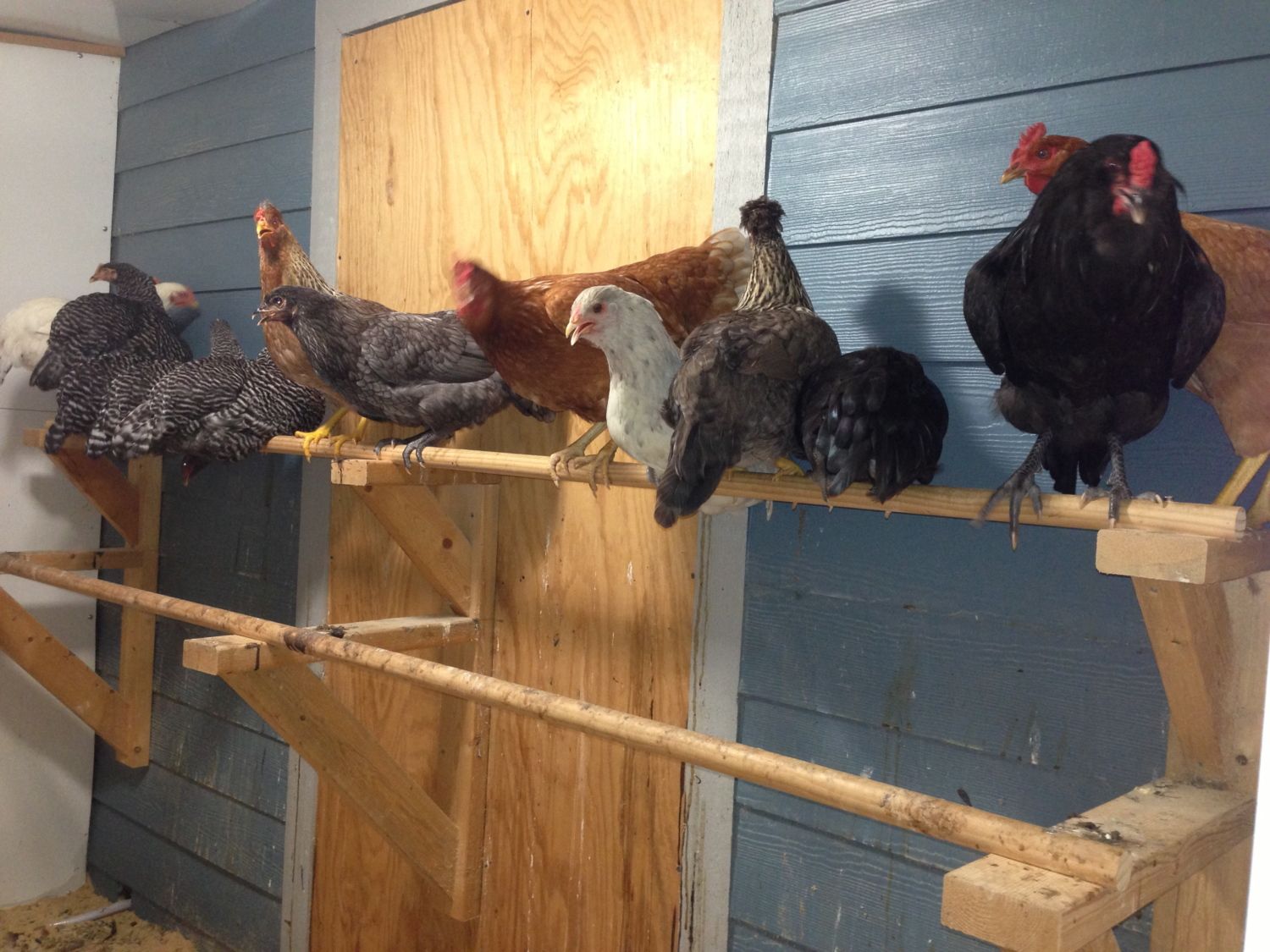 This is 14 chickens out of the 18 that go into this coop at night, (the stoners like to hang out in the basement/dark nest box). I have 3 other roosts, but they want to see if they can all fit on one!