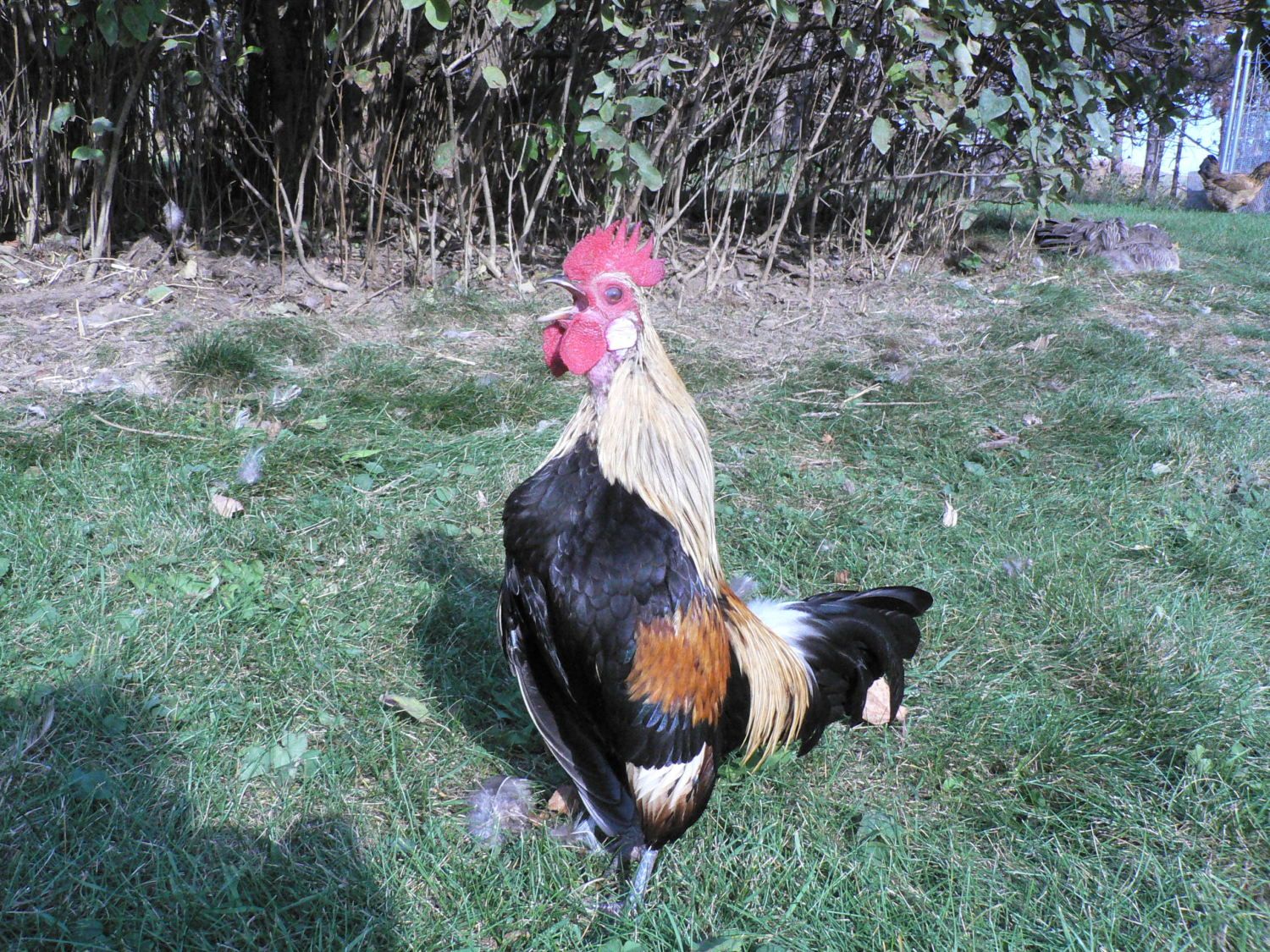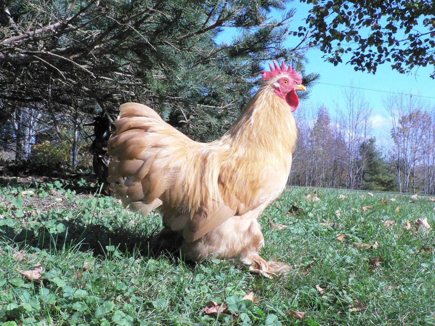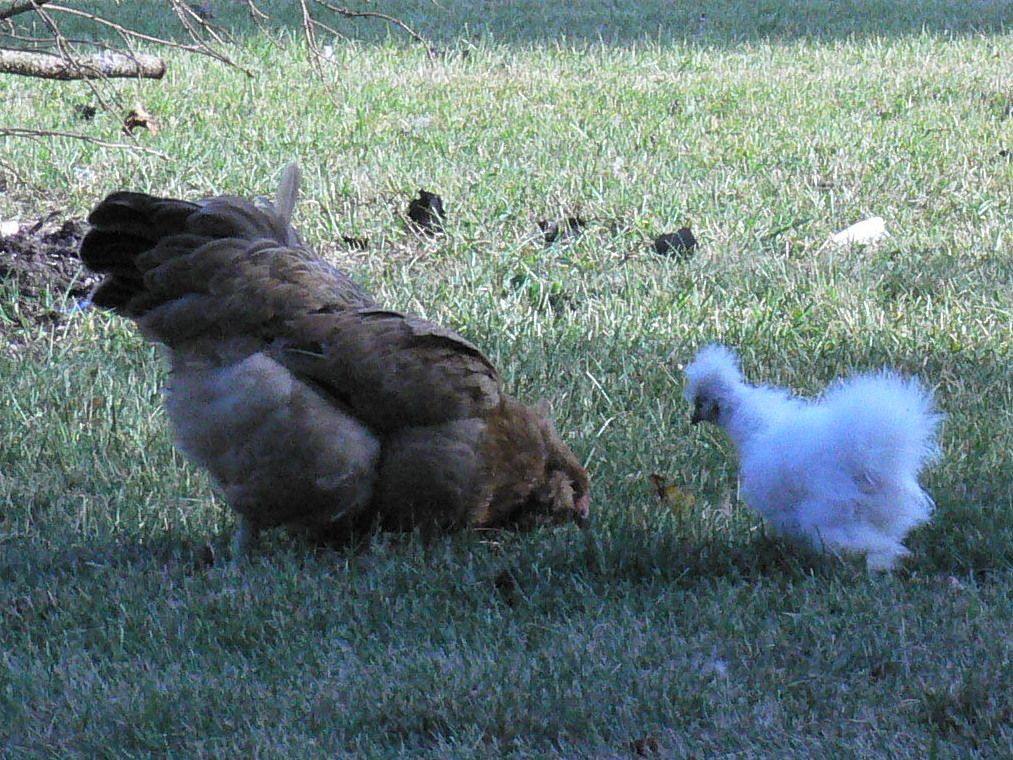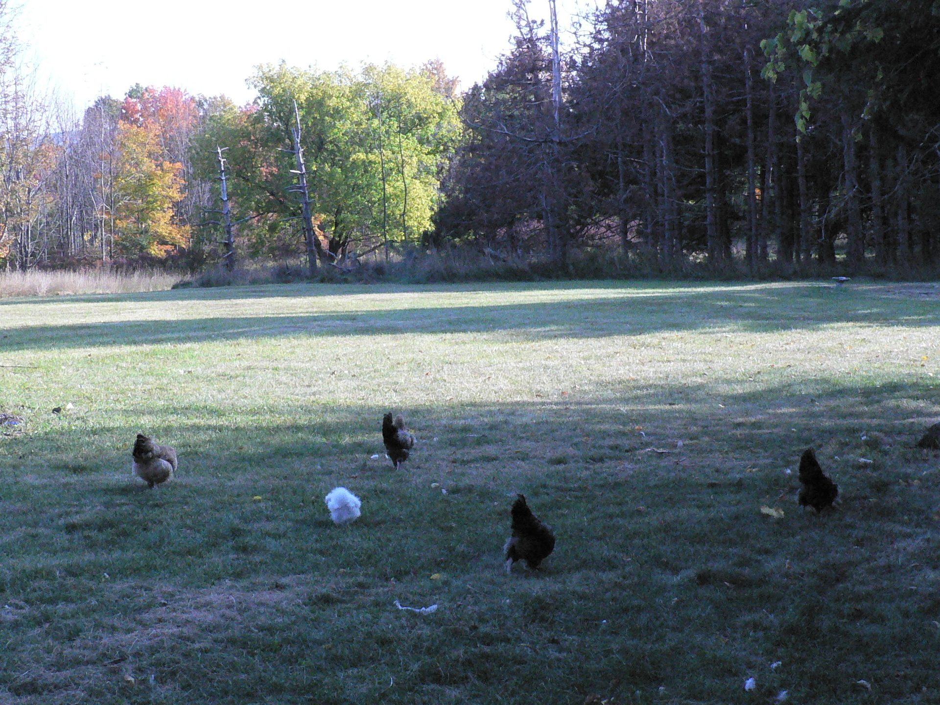 Peach brought her family further away from their pen than ever before. the rooster pens are to the right, in the stand of trees that are casting that shadow. Sillie glows like snow. she's so white she reflects the blue sky, like water or snow, s/he's actually hard to photograph. just tons of light reflecting back in an almost chicken shape.