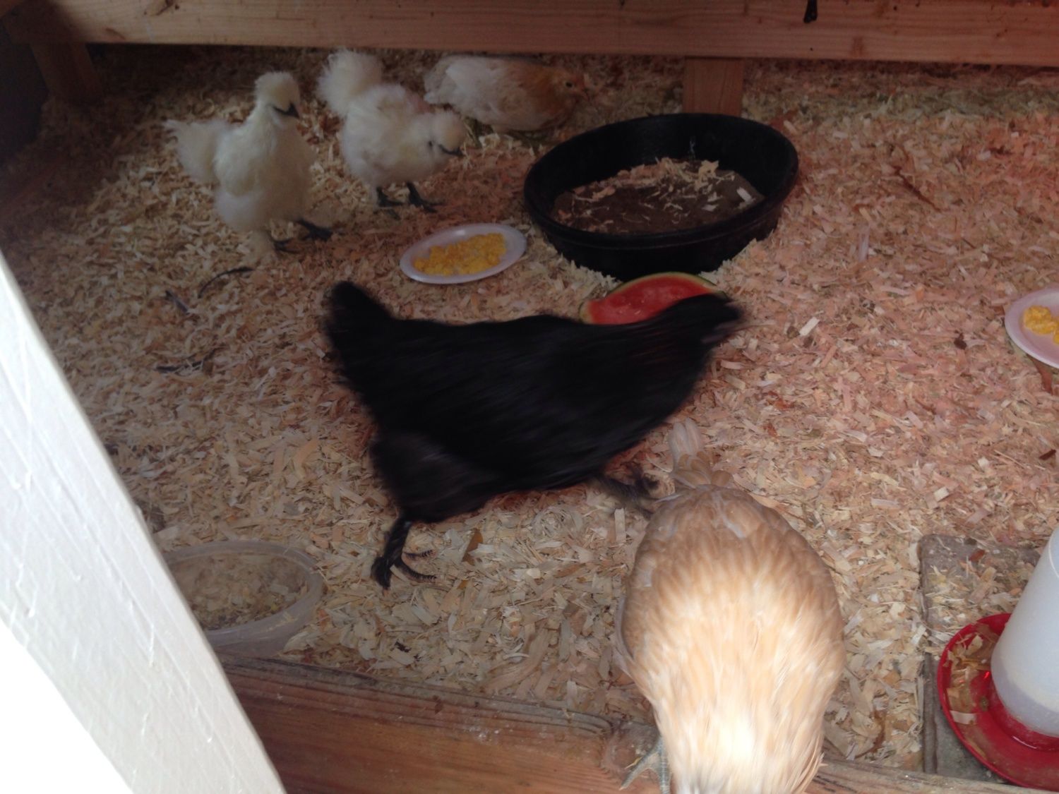 It was a very chickie day! I gave the girls scrambled eggs and watermelon. They ate the eggs right up but only one brave silkie was game for the melon...