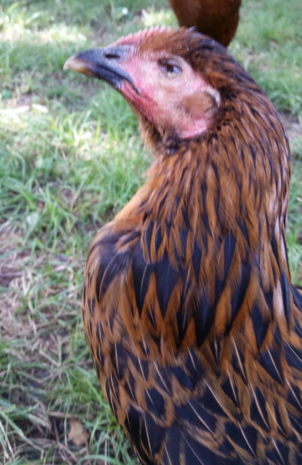 Now, almost a month later, the swelling has gone down on her head and she's back to her bug/seed eating, wing flapping, and running self. For a while I thought she was holding her head a bit tilted but it turned out that it was just that swollen. We took in some hens and pullets from a family friend who had too many to replace the flock lost in the fox attack. We now have 2, 1.5 yr Island Reds and 3, 4 mo Barred Rocks. Currently they all only get together when allowed to range in the yard during the day. Barb is still staying in the house in a dog crate at nights. And while I tried to keep the older and younger ladies in separate coops, when they go up for the night on their own, they all end up in the same coop. So I've given up on trying to keep them separate. Any suggestions on if, when or how to integrate Barb into the new flock? When they are in the yard together, they like to chase Barb around but there is plenty of room for her to get away and they usually aren't persistent about it. I haven't tried to push getting Barb to stay outside in a coop much because I'm hesitant to put her in with the others overnight if her eye is still a potential place for infection or the others to peck at or just take advantage of her weakness.